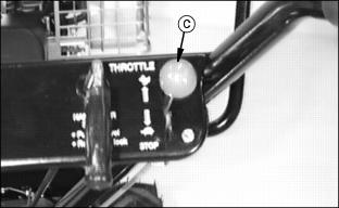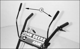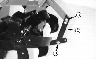 OperatingOperate Safelyˇ Inspect machine before you operate. Be sure hardware is tight. Repair or replace damaged, badly worn, or missing parts. Be sure all safety protective devices are in good condition and fastened in place. Make any necessary adjustments before you operate. ˇ Clear work area of objects that might be thrown. Keep people and pets out of the work area. Stop machine if anyone enters the area. ˇ If you hit an object, stop the machine and inspect it. Make repairs before you operate. Keep machine properly maintained and in good working order. ˇ DO NOT leave machine unattended when it is running. ˇ Only operate during daylight or with good artificial light. ˇ Be sure of footing. Be especially careful when you pull machine backwards with the engine running. ˇ Stay behind the barrier on the handlebar when operating on the side of the machine. ˇ DO NOT attempt to force the tines down by hanging on the handlebar. ˇ Till across a hill - not up and down. Be careful when you change direction on a slope. DO NOT till excessively steep slopes. ˇ Keep a firm hold on the machine handle. ˇ Do not wear radio or music headphones while operating the machine. Safe operation requires your full attention. Rotating Tines are Dangerous - Protect Children and Prevent Accidentsˇ Never assume that children will remain where you last saw them. Stay alert to the presence of children. ˇ Keep children in the house when you are operating the machine. ˇ Turn machine off if a child enters the area. ˇ Use extra care when you come to blind corners, or other objects that may block your vision. ˇ DO NOT let children or an untrained person operate the machine. HELP PREVENT SERIOUS OR FATAL ACCIDENTS: ˇ Be alert at all times, people especially children can move quickly into the area before you know it. ˇ Stop the tines when crossing gravel drives, walks, or roads. ˇ Shut off tiller when you are not tilling. ˇ Keep hands, feet, and clothing away from rotating tines. Wear Appropriate Clothingˇ Wear close fitting clothing and safety equipment appropriate for the job. ˇ Loud noise can cause impairment or loss of hearing, wear a suitable protective device such as earplugs. ˇ DO NOT operate the equipment when barefoot or wearing open sandals. Always wear substantial footwear. Adjust Handlebar HeightAdjust handlebar height by using three holes at bottom of handlebar legs. 2. Remove cap screws, and lock washers (B). 3. Position handlebars at a safe comfortable tilling height. 4. Align holes and secure with cap screws and lock washers (B). Adjust Handlebar SwivelHandlebars may be positioned center, right or left. 1. To move handlebars, pull back on handlebar swivel (A) until lock releases. 2. Swing handlebars left or right. 3. Release handlebar swivel and latch will lock in position by spring tension. If the latch will not lock in position, it may be necessary to lubricate the handlebar swivel lock. See Lubricating Handlebar Swivel in the Service section. Adjust Depth ControlThis tiller is equipped with a eight position depth control handle (A). ˇ Grasp tiller depth control handle and squeeze trigger. ˇ Increase tilling depth: Raise depth control handle. ˇ Decrease tilling depth: Lower depth control handle. ˇ Release trigger to engage appropriate notch in bar. For transporting: Push depth control handle down to the lowest position and engage bottom notch. If you need to till at a deeper or shallower depth, remove hardware (B) and reposition bracket (C) in different mounting holes. Install and tighten hardware. Using Wheel Drive Speed SelectorThis tiller is equipped with a 2-speed transmission, slow and fast. Both wheels of tiller turn at same rate of speed because solid-axle provides them equal power. When the engine is running and the "t" or "r" speed is selected, wheels will turn after main clutch is engaged.