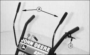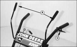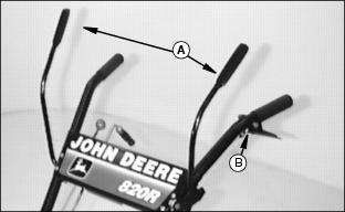 Slow Position: Move Wheel Drive lever (A) forward to the "t" position. This will be your SLOW speed. ˇ Use this "N" position when starting the engine. ˇ In this position, gears in the transmission are disengaged and the tiller may be moved by hand without engine power. Fast Position: Move Wheel Drive lever (A) rearward to the "r" position. This will be your FAST speed. Engage Tine ClutchEngage Tines: Move Tine clutch lever (A) forward (over center) to the "IN" position. ˇ In this position, when the engine is running, this will allow the tiller tines to spin. ˇ Clutch is spring loaded and will engage as main clutch is engaged. Disengage Tines: Move Tine clutch lever (A) rearward (over center) to the "OUT" position. ˇ In this position, when the engine is running, the tiller tines will STOP spinning. ˇ Use this "OUT" position when starting the engine or when transporting tiller. If the tine clutch lever does not shift smoothly or stay in the "IN" engaged position, it may be necessary to adjust the tine clutch linkage. See Adjusting Tine Clutch in the Service section. Using Main ClutchThe main clutch system consists of one set of "F" (forward) Top Levers (A) and one "R" (reverse) Bottom Lever (B). ˇ Pull "F" Top Levers (A) down to the handlebars. In this position, when the engine is running, the tiller tines will start spinning and the drive wheels will turn. ˇ The "F" Top Levers are one piece and can be operated with one hand. It is advised to operate this unit with both hands whenever possible. ˇ If forward drive is sluggish or will not fully engage. See Adjusting "Forward" Drive Belts Tension in the Service section. ˇ Both "F" Top Levers (A) and "R" Bottom Lever (B) are spring loaded to the "N" neutral position. The tiller will STOP. ˇ Use this "N" position when starting the engine.