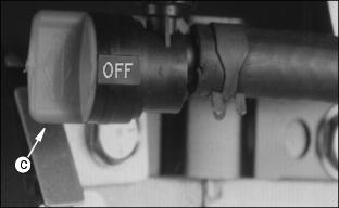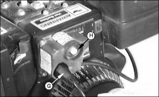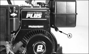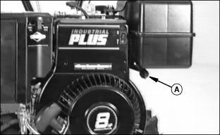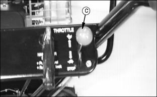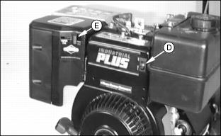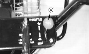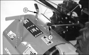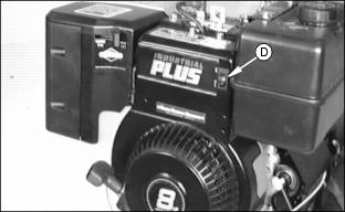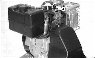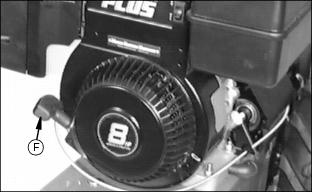 ˇ Release "F" Top Lever (A) before engaging "R" Bottom ˇ Pull "R" Bottom Lever (B) up to the handlebars. In this position, when the engine is running, the tiller tines and the drive wheels will start spinning in reverse. ˇ If reverse drive is sluggish or will not fully engage. See Adjusting "Reverse" Drive Belt Tension in the Service section. Pre-Starting Engine1. Check that engine crankcase oil is full using dipstick (A). If necessary, see Checking Engine Oil in the Service section) 2. Check air filter and pre-cleaner for dirt. Clean as required. If necessary, see Checking Air Filter in the Service section) 3. Check fuel supply. If necessary, see Filling Fuel Tank in the Service section) 4. Make sure Main Clutch (B) is in the "N" neutral position. 5. Put the Wheel Drive Speed Selector Lever (C) in the "N" neutral position. 6. Put the Tine Clutch (D) in the "OUT" (disengaged) position. Using Fuel Shut-Off ValveThis unit is equipped with a 2-position fuel shut-off valve (A). Turn "Red" knob clockwise or counterclockwise to open or close the fuel shut-off valve. ˇ When performing any type of engine service. ˇ Fuel shut-off valve must be in the full OPEN (ON) position for proper fuel delivery to the engine. Starting Engine1. Make sure Main Clutch is in the "N" neutral position. 2. Put the Wheel Drive Speed Selector Lever (A) in the "N" neutral position. 3. Put the Tine Clutch (B) in the "OUT" (disengaged) position. 4. Set throttle lever (C) at "FAST" (r) position. 5. Check fuel shut-off valve. Valve must be in full open (ON) position. 6. Move ON/OFF switch (D) to the "ON" position. ˇ This engine is equipped with a 5-position choke lever. ˇ Cold engine: move lever to full CHOKE "k" position. ˇ Warm/hot engine: move lever somewhere between CHOKE "k" and RUN position. Manual Start - Standard Equipment ˇ Grasp starter handle (F) and pull rope out slowly until it pulls harder. This is the compression stroke. ˇ Pull rope with a rapid continuous full arm stroke. Let rope rewind slowly. Electric Start - Optional Equipment