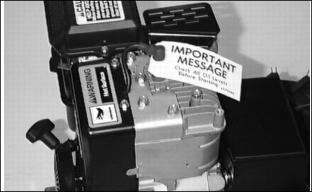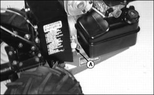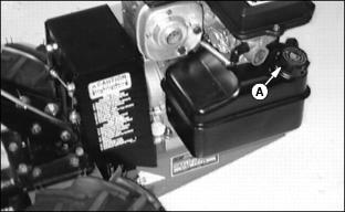 1. Position tiller on a flat level surface. 2. Remove the oil level (vent) plug (A). 3. Check oil level. Oil level should run out of or be up to check hole. NOTE: Gearbox capacity is approximately 946 mL (32 oz.) 4. If necessary, add oil at the oil fill port (B). (See Gear Oil in SERVICE section for correct oil.) 5. Install oil level (vent) plug. Remind customer to drain and refill gearbox after first 25 hours of operation or at the end of first season, whichever comes first. Fill Fuel Tank SafelyAdd Fuel1. Remove fuel cap (A) and "IMPORTANT" shipping tag. 2. DO NOT fill tank to top; fuel can expand. Connect Spark Plug