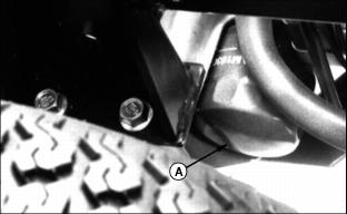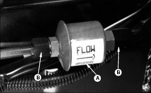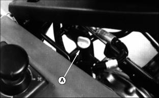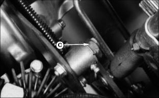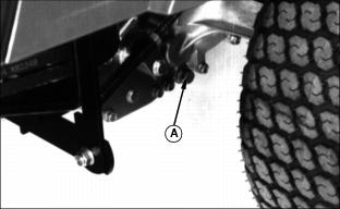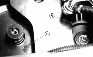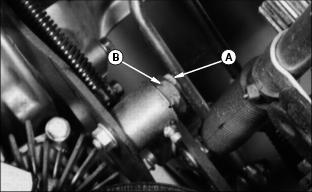 Checking The Transmission Oil LevelCheck the oil level before you start the engine. 1. Lift the seat to the second position. 2. Turn the dipstick (A) to remove it. 3. Wipe the dipstick. Install it but do not turn it. Pull it out. 4. Oil should be in the XX area at the bottom of the dipstick. 5. If not, pour oil into the dipstick tube. 6. Install and tighten the dipstick. Changing The In-line Hydraulic Oil Filter1. STOP the engine. LOCK the park brake. Wait until the engine and the transmission are cool. 3. Remove the hydraulic filter (A): ˇ Loosen the two fittings (B). ˇ Catch dripping oil in a container. ˇ Install a new filter with an O-ring on each side. 5. Also change the hydraulic sump filter (next). Changing The Hydraulic Sump (Transaxle) Filter1. Use a filter wrench to turn the sump filter (A) counterclockwise. Remove the filter. 2. Catch dripping oil in a container. 3. Put a film of clean transmission oil on the seal of the new filter. 4. Install the filter. Turn it clockwise until it contacts the mounting surface. 5. Then turn the filter 1/2 turn more. 6. Run the engine a short time. Stop the engine. 7. Check the hydraulic oil level. See Checking The Transmission Oil Level in this section. 8. Add oil, if necessary. Do not run the engine if the transmission oil level is low. Changing The Transmission Oil1. STOP the engine. LOCK the park brake. Wait until the engine and the transmission are cool. 2. Remove the transmission oil dipstick. 3. Put a container under the drain plug (A). 4. Remove the plug. Drain the oil. Install the plug. 5. Pour oil into the dipstick tube. The capacity is 2.4 L (2.5 qt). 6. Install and tighten the dipstick. 7. Run the engine a short time. Stop the engine. 8. Check the transmission oil level. See Checking The Transmission Oil Level in this section. Replacing The Transmission Belt2. Lift the seat to the second position. 3. Stand on the left side of the Front Mower. Pull and hold the idler sheave toward you (A). 4. Remove the belt from the front sheave (B) and the rear sheave. 5. Pull and hold the idler sheave as you install the new belt. Adjusting Transmission NeutralAdjust transmission neutral to assure that machine DOES NOT creep when pedals are in the neutral position. You will need a jumper wire, floor jack, and jackstand for this procedure. 1. Park machine on level surface. Park brake disengaged. PTO disengaged. Transmission in neutral. 2. Block right drive wheel to prevent machine from moving. 3. Raise left drive wheel off ground with floor jack. Place a jackstand under left axle housing to prevent wheel from dropping. NOTE: DO NOT engage differential lock during this adjustment. 4. Have someone push down center of seat cushion to activate seat safety switch, or disconnect connector from seat switch and install jumper wire across wiring harness connector posts. NOTE: DO NOT turn PTO switch to the on position as the operator presence circuit is bypassed for this procedure and the PTO could engage. 5. Loosen bolt (A) on adjuster cam (B). 6. Start engine and run at fast idle. 7. Rotate cam (C) until left wheel does NOT spin. 8. Tighten bolt. Readjust cam if wheel begins to spin again. |