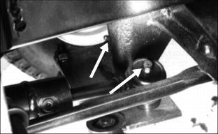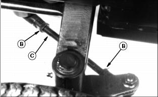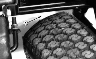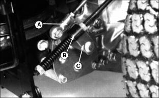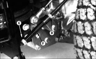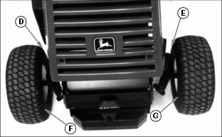 Service Steering & BrakesGreaseUse grease based on the expected air temperature range during the service interval. The following greases are preferred: ˇ John Deere MOLY HIGH TEMPERATURE EP GREASE. ˇ John Deere HIGH TEMPERATURE EP GREASE. Other greases may be used if they meet one of the following: ˇ SAE Multipurpose EP Grease with a maximum 5 percent molybdenum disulfide. ˇ Greases meeting Military Specification MIL-G-10924F may be used as arctic grease. Lubricating The Steering Spindles And Ball Joints1. Lubricate the left and right rear axle spindle. (The left rear axle spindle is shown.) 2. Lubricate ball joint and center spindle. Use John Deere Multipurpose Grease or equivalent. Lubricating The Transmission Control Arm1. Lift the seat to the second position. Lubricating The Pedal PivotNOTE: The picture is a mirrored image. Use John Deere Multipurpose Grease or equivalent. Adjusting The Brake1. Park the Front Mower on a hard, level surface. 2. STOP the engine. UNLOCK the park brake. 3. Remove the cotter pin (A) from the back of the trunnion (B). 4. Remove the trunnion from the brake arm (C). 5. Turn the brake arm clockwise until you feel resistance. Hold the arm there. 6. Turn the jam nuts (D) on the rod until the trunnion fits into the brake arm. Your Front Mower will have two jam nuts. 7. Install the cotter pin in the trunnion. 8. Tighten the nut (E) until the spring (F) is 75 mm (3 in.) long. Checking The Toe-In1. Park the Front Mower on a hard, level surface. 2. Stop the engine. Lock the park brake. 3. Turn the left, rear wheel as far as it will go to the left. 4. Check the clearance (A) between the left tire and the rod. Clearance should be 6-13 mm (1/4-1/2 in). 5. If not, adjust the left tie-rod. ˇ Turn the tie-rod (C) until clearance in step 4 is correct. ˇ Flatten washer to nut and tie-rod flats. 6. Turn the steering wheel so the rear wheels are in the straight-ahead position. 7. Measure distance from D to E: ˇ At the front of the rear wheels. ˇ At the widest part of the tires. 8. Measure distance from F to G: ˇ At the rear of the rear wheels. ˇ At the widest part of the tires. 9. Distance (D) to (E) should be 3 mm (1/8 in.) less than distance (F) and (G). 10. If not, adjust the right-hand tie rod length until the toe-in is correct. (The left-hand tie rod is not changed). See step 5. |