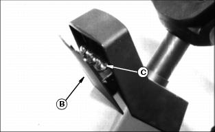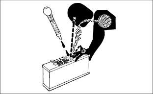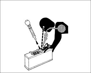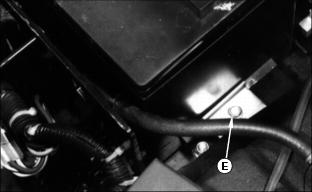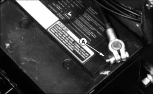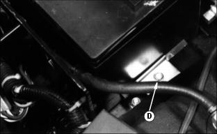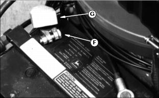 Service ElectricalCleaning Or Replacing Battery2. Loosen the bolt (A) and disconnect the negative cable from the terminal. 3. Pull the cover (B) away from the positive terminal. Loosen the bolt (C) and disconnect the cable. 4. Remove the screw (D) and hold-down bracket from each side of the battery. 6. Clean the battery and related parts with a solution of one part baking soda and four parts water. Keep the solution out of the battery cells. 7. Rinse all the parts and let them dry. ˇ The vent holes in the cap must be open. ˇ The electrolyte level must be 6 mm (1/4-in.) above the plates. 9. Install the battery. Install the hose in the hole of the battery base and through the hole in the side of the frame. Install the hold-down and screw (E) on each side of the battery. 10. Install the positive cable and tighten M8 bolt (F). 11. Install the cover (G) over the terminal. 12. Install the negative cable and tighten the M6 bolt (H). Checking Battery Electrolyte Level2. Remove battery manifold cap (A).