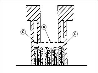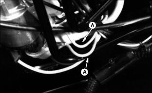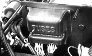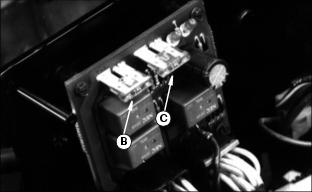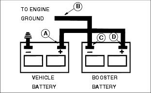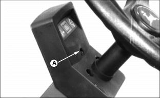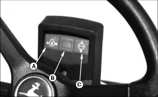 3. Electrolyte (C) should be 6 mm (1/4 in.) above plates (D). 4. Add distilled water if necessary. 5. Install manifold cap. Be sure manifold cap hose is behind positive cable. Charging the BatteryFollow instructions on the battery charger or in the charger operator's manual, or use the instructions below as a guide. ˇ Wait until the battery has warmed to room temperature. Do not charge a frozen battery. ˇ Check the electrolyte level of each cell. (See Checking Battery Electrolyte Level in this section.) ˇ Install the battery cap(s) on the battery. Turn OFF and unplug the charger before you connect cables to the battery or disconnect cables from the battery. If the battery becomes warm to touch during charging: ˇ Stop charging the battery until it cools. 1. Remove and clean battery. (See Cleaning or Replacing Battery in this section.) 2. Check electrolyte level. (See Checking Battery Electrolyte Level in this section.) 3. Leave cell caps on battery while you charge it. 4. Connect positive (+) charger cable to positive (+) battery terminal. 5. Connect negative (-) charger cable to negative (-) battery terminal. 8. Unplug charger cord. Remove charger cables. Charging RatesSee your battery charger or charger operator's manual for information on charging. Or read the information below to FULLY CHARGE your battery. For a charger with a CURRENT ADJUSTMENT CONTROL: ˇ Adjust the control to 10 amps. ˇ Charge the battery for 6-8 hours. For a charger with a switch for MAINTENANCE FREE, DEEP CYCLE, or NORMAL (CONVENTIONAL) setting: ˇ Use the MAINTENANCE FREE or DEEP CYCLE setting. For a charger with SLOW CHARGE, FAST CHARGE, or BOOST CHARGE setting: ˇ DO NOT use the BOOST CHARGE setting. ˇ Use the SLOW CHARGE setting: a. For a charger rated at less than 10 amps. ˇ Use the FAST CHARGE setting: a. For a charger rated at 10 amps. NOTE: Your charger may have an AUTOMATIC STOP to prevent charging the battery when the battery is fully charged or when the battery is not in condition to take a charge Using Booster Battery1. Connect positive (+) booster cable to booster battery positive (+) post (D). 2. Connect the other end of positive (+) booster cable to vehicle battery positive (+) post (A). 3. Connect negative (-) booster cable to booster battery negative (-) post (C). 4. Connect the other end of negative (-) booster cable (B) to engine ground away from battery. Checking The Indicator Lights1. Check the operation of the indicator lights: b. LOOK: Two lights should come on: 2. Turn the key to the START position. ˇ LOOK: Coolant temperature indicator light (C) should go ON. 3. If an indicator does not light, replace the bulb. See Replacing The Indicator Light Bulb in this section. 4. If the new bulb does not light or no indicators work, see your John Deere dealer. Replacing An Indicator Light Bulb2. Carefully pry the back cover (B) loose. 3. Pull the burnt out bulb (C) straight out: Do not twist it. 4. Push the new bulb straight in. 5. Install the cover. Fasten it with the screw. Replacing The Fuses1. Lift the seat to the second position. 2. Pull the fuse cover (A) off. 3. Replace the burnt-out fuse with a 15-amp fuse only: ˇ (B)-Fuse for controls and seat safety switch circuits. ˇ (C)-Fuse for headlight circuit. 4. Pull out the burnt-out fuse. Push in a new fuse. Replacing The Fusible Linksˇ When none of the electrical parts on the Front Mower work OR |