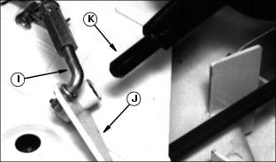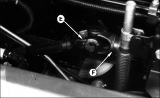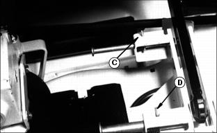 Installing MowerInstalling The Mower1. Park the front of the Front Mower next to the rear of the mower. Push arms should be in the raised position. Lift the seat to the second position. 2. Turn the crank clockwise to lower the mower lift frame. 3. Pull out the spring pins (A and B) on each side until you can turn the latch rods (C and D) into the slots as shown. 4. Hold up the driveline and push the mower under the Front Mower. Lift the coupler and the driveline over the top of the transaxle. NOTE: When you install the coupler on the vehicle gearbox shaft for the first time, you must first remove the plastic sleeve from the gearbox shaft. 5. Install the coupler (E) on the vehicle gearbox drive shaft: ˇ Pull and hold the coupler sleeve (F) back. ˇ Push the coupler onto the shaft. ˇ Push and pull the coupler until you are sure it is locked on the shaft. 6. Remove the ring (G) and the drilled pin (H) from the rear of the mower on each side.