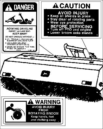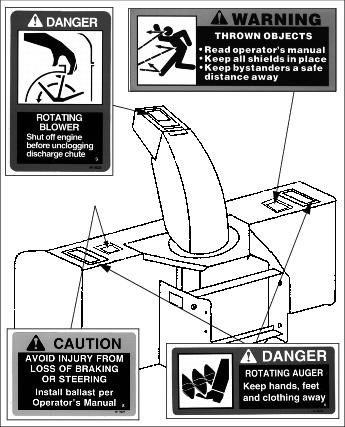 SAFETY SIGNSSafety-Alert SymbolRead and recognize safety information. Be alert to the potential for personal injury when you see this safety-alert symbol. On your machine safety labels, the words DANGER, WARNING, and CAUTION are used with this safety-alert symbol. DANGER identifies the most serious hazards. In this manual, the word CAUTION and this symbol call attention to safety messages. Snowblower Machine Safety LabelsBroom safety labelsFront Blade Safety LabelsCertification LabelThis OPEI label on your snow blower indicates that this model has been certified by an independent laboratory for compliance with American National Standard B-71.3-1995, "Safety Specifications" for Snowblowers. |