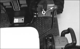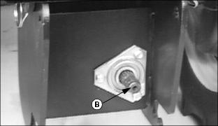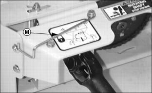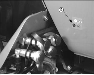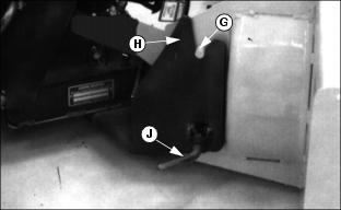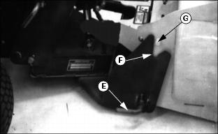 NOTE: Loop of bracket goes inside tractor yoke to control the end piece of driveline. 1. Put driveshaft (C) on PTO rod support (D). (Make sure support is installed on the inside of the left-hand side of driveshaft shield.) NOTE: MAKE SURE lever (E) is in the unlocked position shown. 2. Lower front hitch with lift lever. 3. Move tractor/front mower forward slowly until slot (F) on front hitch lines up with pin (G) on snowblower. 4. Raise front hitch until groove on hitch bracket (H) LOCKS in place under pin (G). 5. Check to be sure that locking pins (J) are ENGAGED into bracket (H) and snowblower. 6. Lower snowblower to the ground. Connecting Driveline1. Remove driveline from PTO rod support (M). 2. Pull coupler (A) back on driveline to lock collar open. 3. Install driveline to tractor PTO shaft (B). 4. Push driveline forward until coupler LOCKS in place. Connecting Hydraulic HosesNOTE: If Hydraulic Angling Kit is installed, hoses from that should be to the outside of the bracket and strapped to the lift cylinder hose. 1. Put snowblower hydraulic chute hoses (A) to the inside of bracket (B) on front hitch as shown. (This helps to prevent damage to hoses and possible injury. 2. Put hoses through ring (D) on side of tractor. 3. f you have installed the "Angling Kit" on your tractor for use with the rotary broom or blade do the following: · Remove hoses (E) from the top two couplers on tractor. (See decal on tractor platform for reference.) · Put dust plug cap (F) on hose coupler. NOTE: To connect hoses to couplers: ·Push and hold tractor coupler sleeve back. ·Put male-end hose fitting into coupler. ·Pull hose to check that hose end is LOCKED in coupler. · Put dust plug cap (G) through loop on coupler and connect in plug on snowblower hydraulic hose. · Install each snowblower hydraulic hose (H) to tractor. Match color on hose with decal on tractor platform. If you have not installed the "Angling Kit" on your tractor: · Install each snowblower hydraulic hose (H) to tractor. Match color on hose with decal on tractor platform. Checking Discharge Chute RotationNOTE: Lable (B) is color coded with 1 is yellow, 2 is silver, 3 is black and 4 is green. Match caps to on each end of the hoses. 2. Use control lever (A) to turn chute in both directions: · Hoses connected to couplers "1 & 2": Move SCV lever (A) to left to rotate attachment to the left or to right to rotate attachment to the right. There is also a color coded label (B) to assist you. · Hoses connected to couplers "3 & 4": Move SCV lever (A) forward to lower attachment and rearward to raise attachment. This SCV is also equipped with a "float" position to permit attachments such as blades or loaders to follow ground contours when lowered to operating position. Push lever (A) past valve detent to attain "float" position. Detent can be felt when moving lever forward. NOTE: If chute does not move in the direction indicated, reverse hose location in couplers. 3. Chute should turn 90 degrees to each side. If it does not: