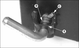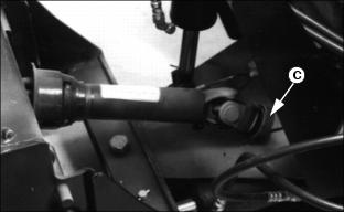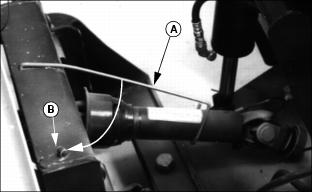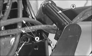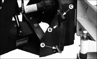 Checking Hydraulic Hoses and Fluid LevelRemove transaxle hydraulic fluid dip stick. Check fluid level. If necessary, add fluid. (See your tractor operator's manual for correct procedure. · Move hydraulic control levers back and forth to check for leaks. · MAKE SURE to check for fittings or connections that bind or rub against each other. Installing BladeNOTE: Front Hitch Kit and Angling Cylinder Kit must be installed before installing the Front Blade. 1. Place blade on a level surface 2. Release pins (A) from LOCKED position (if locked out). 3. Use the tractors Selective Control Valve lever (B) to align the notches on both sides of hitch, with rod (C) on the Front Blade. 4. After the rod ends are in the hitch notches, slowly raise blade by using the tractors Selective Control Valve lever. 5. Make sure that the Front Hitch L-pins (A) have LOCKED in the hole on the front blade mounting Cable Assembly54-Inch Front BladeNOTE: Make Sure cable assembly (A) to the rear hole (B) on front hitch. Move cable assembly (A) to the rear hole (B) on front hitch. Install PTO Shaft In Wire Support51-Inch Rotary BroomInstall PTO shaft in wire support as shown. Install Broom1. Line up tractor hitch and broom frame. 2. Pull and lock out J-pins (A). 4. Drive tractor forward until notches (B) on hitch are below pins (C) on frame. Lock J-Pins2. Raise hitch until J-pins (A) snap into holes on hitch. 5. CHECK: J-pins must protrude all the way through the side of the hitch frame. If not, reverse pins. See Reversing J-Pins in this section. Reversing J-PinsNOTE: The legs of the J-pin have different dimensions for the end to the rolled pin hole: 23 mm (A) and 27 mm (B 1. If end of J-pin does not protrude through the side the hitch, or if the broom detaches from the hitch when slid to the extreme right or left position, reverse the leg of the J-pin. 2. Drive out roll pin (C) from J-pin with punch. Save roll pin. 3. Pull J-pin from bracket and remove spring. 4. Reverse end of J-pin and install through bracket and spring NOTE: Spring (D) must go between roll pin (C) and inside of bracket (E). 6. Slide broom to the extreme right and the extreme left to ensure the J-pins remain in the mounting holes. Install Chain and Pin AssemblyNOTE: MAKE SURE assembly is in the REAR hole on the front hitch. 1. Move cable assembly or chain and pin assembly (A) to the rear hole (B) on front hitch. Connect PTO Shaft