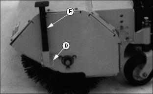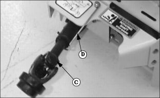 1. Remove wire support from under PTO shaft. 2. Pivot wire support (A) to left and push it into clip (B). 3. Pull and hold back collar (C). 4. Push end onto tractor driveshaft. 6. Push in until collar locks into shaft. 7. Push and pull end of driveline to make sure it is fastened. 9. Remove spring clevis pin (D) and stand (E) from each side of broom. 10. Invert stands and install spring clevis pins prior to operating broom
