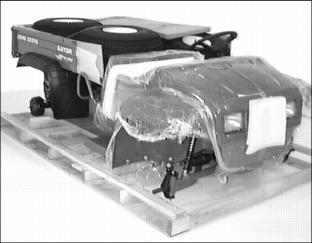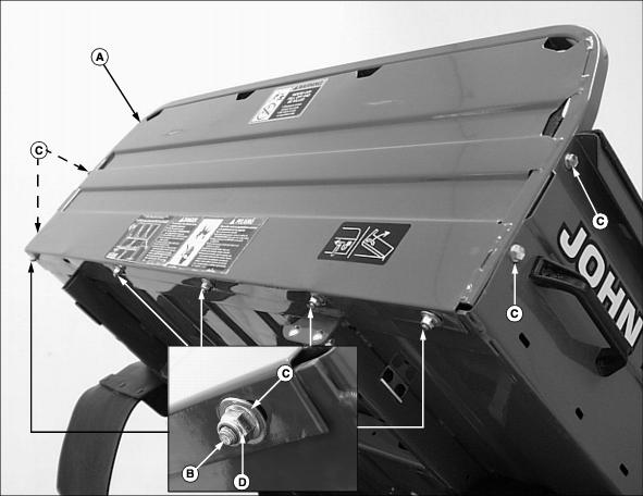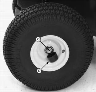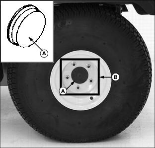 AssemblyPrepare for Assembly1. Remove utility vehicle from shipping crate. 2. Raise vehicle using a safe lifting device. Position safety stands under vehicle. 3. Locate and identify all assembly parts and hardware. 4. The steel cargo box is attached on each side of the frame with two shipping straps (A). NOTE: Thread forming screws (B) must be retained for installation of vehicle load guard. Thread forming screws (B) attaching the rear shipping strap to the cargo box on each side of the vehicle may be difficult to remove. It may be necessary to loosen the hardware attaching the rear of each cargo box fender to the bottom of the cargo box. 5. Remove thread forming screws (B). ˇ Retain thread forming screws (B) removed from each of the four shipping straps. 6. Use a safe lifting device to lift the steel cargo box off of the vehicle frame. ˇ Remove thread forming screws (C) and shipping straps (A). 7. Install both thread forming screws (C) back into holes they were removed from on RIGHT side of vehicle. Install thread forming screw (C) back into the rear hole only on the LEFT side of the vehicle. ˇ Discard shipping straps and one thread forming screw removed from the front LEFT side of utility vehicle. Checking Tire Pressure2. Check tire pressure with an accurate gauge. Install Wheels and TiresCheck Tire Inflation Pressuresˇ Keep all tires inflated to 69 kPa (10 psi). ˇ Mount wheels with valve stem to the outside. Installing Rear Wheels1. Install plastic cap (A) inside each rear wheel axle shaft hole. 2. Attach one wheel to each rear axle using five wheel nuts (B), tighten until snug.