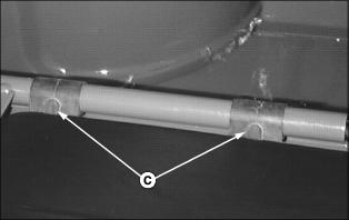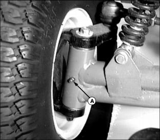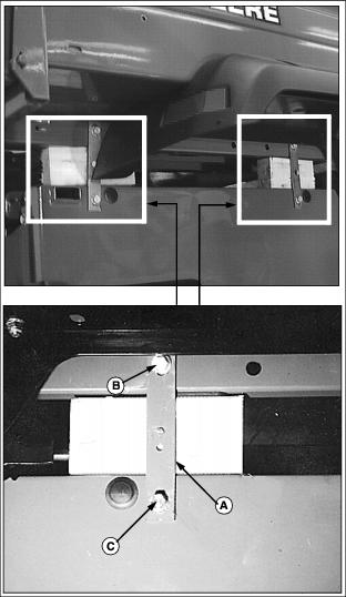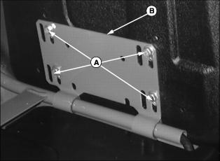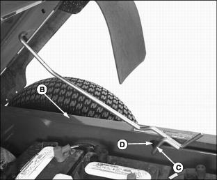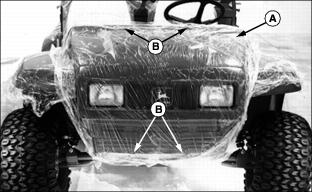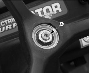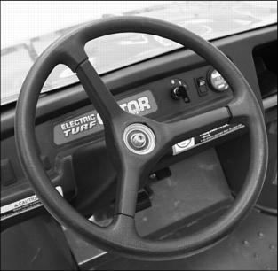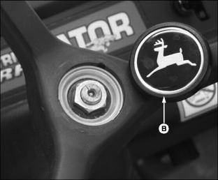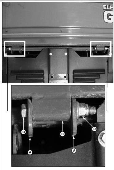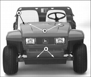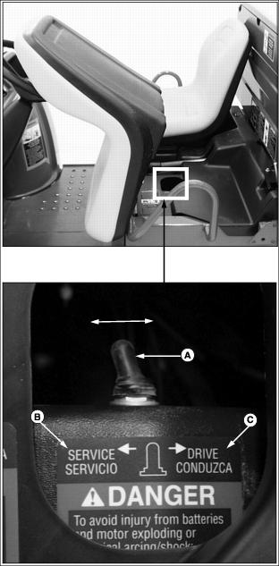 1. Attach one wheel to each side of vehicle using a ˇ Tighten cap screws to 90 Nˇm (66 lb-ft.). Install Steering WheelCoat steering shaft with multi-purpose grease. 3. With front wheels straight and facing forward, install steering wheel. 4. Install hex nut (A) and tighten. Lubricating Front King PinsNOTE: In extreme conditions lubrication should be done more frequently. 1. Park vehicle on hard, level surface. 2. Turn the key switch to the OFF "0" position. 3. Move the directional control lever to the NEUTRAL (N) position. 5. Raise front of utility vehicle with a safe lifting device. 6. Lubricate one grease fitting (A) on each king pin axle arm with the preferred grease or an equivalent. (See Grease in the Service-Miscellaneous section.) Install Operator Seat1. Remove hardware (A) from bottom of seat base bracket (B). 2. Position rubber seat bushings (C) onto seat frame rail with tabs facing to the rear. 3. Position seat base bracket (B) onto rubber seat bushings (C). NOTE: There is only one correct position laterally for each seat. Use inboard slots shown when installing the seats. Both vehicle seats are adjustable. See Adjusting Seats in the Operating section for seat adjustment procedure. 4. Rotate seat base bracket (B) into an upward position and attach seat with hardware (A). Install Load Guard1. Position load guard (A) onto the cargo box as shown. ˇ Bottom lip of load guard should be installed to the underside of the cargo box. ˇ Square tubular frame surrounding the perimeter of the load guard should be attached inside the cargo box. 2. Attach bottom of load guard using M8 x 20 carriage head bolts (B), flat washers (C) and flanged lock nuts (D). ˇ Tighten hardware to 25 Nˇm (18 lb-ft.). 3. Attach sides of load guard using thread forming screws (C). NOTE: Screws (C) were retained when shipping straps were removed from the cargo box. Install Cargo Box1. Install cargo box onto the vehicle frame. Align frame tabs (A) and cargo box bushings (B). NOTE: Install cap screws with threads facing to the outside of the vehicle. 2. Attach box at rear on each side using M12 x 90 cap screws (C) and flanged lock nuts (D). NOTE: If it is necessary to tighten cap screws to squeeze tabs to minimize noise from vibration. Spray lube is used to eliminate squeaks until pivot points wear in. 3. Tighten cap screws pulling in tabs until they contact ends of bushings. 4. Spray bushings and tab area with a spray lubricant. Install Cargo Box Support RodCut tie strap and release support rod from stored position on cargo box frame. ˇ The 90° bent end of rod (A) is installed in cargo box frame. 5. Push inward on support rod forcing it over sill (B). 6. Route end of support rod (C) into slot (D). 7. Lift up on cargo box and latch rod into notch in slot. Adjust Cargo Box LatchThe cargo box latch is installed in the lowest position when shipped from the factory. For complete instructions on how to adjust the latch, see Adjust Cargo Box Latch in the Service-Miscellaneous section. Remove Protective Plastic From Hood and Front Fendersˇ Loosen and remove four screws (B). ˇ Carefully lift hood up and off vehicle. 3. Using a sharp utility knife, carefully slit protective plastic where fenders join metal frame. 4. Pull plastic up and away from fenders. Remove remaining plastic in joint by pulling from below. 5. Install hood (A) onto vehicle. ˇ Install and tighten top two screws (B). ˇ Push hood upward. Allow equal clearance around each headlight housing. ˇ Install and tighten two bottom screws (B). 6. Clean plastic and painted surfaces. (See Cleaning and Polishing Plastic Hood and Fenders in the Service-Miscellaneous section.) Charge the BatteriesFor complete instructions on how to operate the battery charger provided with this utility vehicle, review the instructions supplied with the charger and see Using the Battery Charger in the Operating section. Using the Service/Drive SwitchNOTE: This utility vehicle is packaged and shipped from the factory with the service/drive switch in the SERVICE position. This utility vehicle is equipped with a two position service/drive toggle switch. ˇ Raise and tilt operator seat forward to locate switch. Service PositionWhen the vehicle service/drive switch (A) is moved to the SERVICE position (B) the vehicle is disabled and prohibited from being driven. The service/drive switch should be moved to the SERVICE position when: ˇ Performing any service function on the vehicle. ˇ The vehicle is not going to be in service for an extended period of time (one month or more). Drive PositionWhen the vehicle service/drive switch (A) is moved to the DRIVE position (C) the vehicle controller is energized. When the key switch is turned to the ON "1" position, controls are energized and the vehicle is ready for normal operation. |