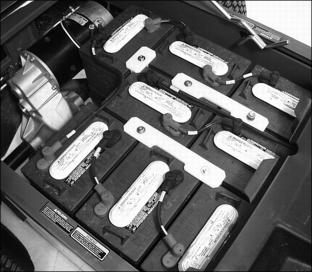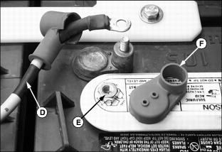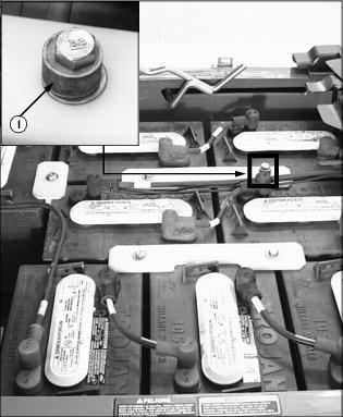 NOTE: Battery positive "+" and negative Battery cables are of specific length and labeled for each connection. See Battery Position and Connection Diagram in this section or refer to the safety/diagram label attached to the front of the vehicle cargo box the for proper installation. 12. Remove cables (D) from battery terminals that are corroded. Loosen and remove hex nut (E). · Remove rubber post cover (F). 13. Remove corrosion from battery terminals and cable ends. · Clean battery terminals and cable ends with a solution of one part baking soda to five parts water. Use a wire brush if additional cleaning is required. · Rinse all parts with clean water and allow to dry. Replacing Batteries· Remove battery hold down bolts (G). · Remove battery hold down(s) (H). · Carefully lift the battery out of the vehicle. Store the battery until it can be properly disposed of. · Clean plastic battery tray and battery hold downs if corroded or rusty. · If necessary, remove battery tray and check vehicle supports for corrosion. · Clean area with a solution of one part baking soda to five parts water. · Rinse area with clean water and allow to dry. 2. Paint areas affected by rust or corrosion with acid resistant paint. 3. Install batteries in the same position and orientation as shown in the Battery Position/Connection diagram. (See Position and Connection Diagram in this section or diagram attached to the front of the cargo box.) 4. Install battery cables using the Battery Position/Connection diagram as reference. · Install rubber post cover (F). · Tighten each terminal connection hex nut (E) to 14-16 N·m (124-142 lb-in.). 5. Replace the proper terminal boots (C) (red on positive, and black on negative) securely over each battery terminal. NOTE: Spacer (I) must be installed under the head of the front left battery hold down bolt with standard T105 batteries only. Use of the spacer will allow the battery to be properly installed and the hold down bolt to be accurately torqued. 6. Install battery hold down (s). · Torque hold down bolts to 7-9 N·m (62-80 lb-in.). 7. Check the electrolyte level in each battery cell. Checking Battery Electrolyte LevelsChecking and maintaining electrolyte levels is important to the care and life of the batteries. Improper care of the batteries can lead to premature battery failure due to cell dilution and imbalance. Electrolyte levels drop during discharge and rise during charging. Therefore, it is essential that the electrolyte levels be checked: · After each week the vehicle is used. · At the recommended service interval if the vehicle is in storage. (Refer to the Service Interval Chart section.) NOTE: To maintain specific gravity balance, battery fluid levels should be the same in all 24 battery cells. Battery Electrolyte GuidelinesNOTE: Overfilling or underfilling the batteries will void vehicle and battery warranties. · It is recommended that distilled water be used for filling battery cells. If distilled water is unavailable, any water safe for drinking (except mineral water) can be used. Water that is not distilled should be analyzed. Make sure that the mineral contents of the water used are below those listed in the following table. · If the electrolyte level is low, add water near the end of the charge cycle or after taking the battery off charge. Never allow the electrolyte level to drop below the tops of the plates (A) because the exposed portion of the plates will become permanently inactive due to sulfation. · Never overfill a battery cell above the battery cap level indicator (B).