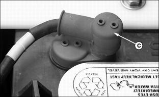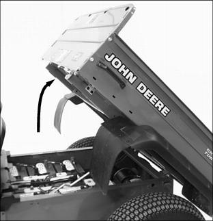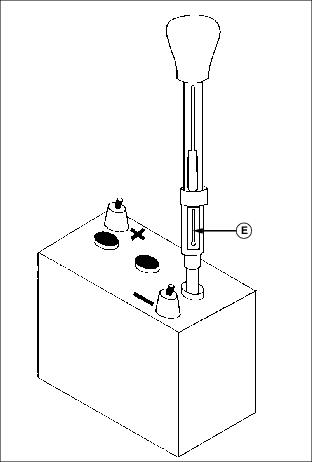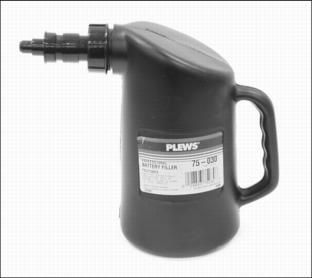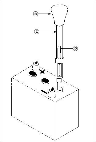 · MINIMUM electrolyte fill level (D) is 3 mm Overfilling the batteries will result in electrolyte loss through the vent caps. This provides a path for self discharge of the battery and also causes corrosion problems. · Batteries will need to be watered more often: · Note any large differences in the amount of water needed from cell to cell. All battery cells should gas approximately the same amount, large differences may indicate a defective cell. Automatic Watering DevicesNOTE: The automatic battery filler must be ordered separately from your John Deere dealer. An automatic battery filler container can be used to maintain the correct electrolyte level within the battery cells. This 1.9 L (2 qt) professional battery filler shuts off automatically when battery cells are properly filled. Checking Electrolyte Level-Before Charging1. Park utility vehicle on a hard, level surface. 2. Turn key switch to the OFF "0" position. 3. Move directional control lever to the NEUTRAL "N" position. 5. Lift and secure cargo box in the raised position. 6. Check battery electrolyte level. · Carefully remove the battery cap. Look into each cell to see if the electrolyte level is above the top of the plates.
