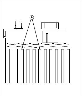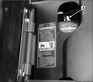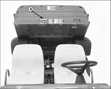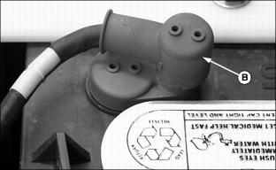 · If the electrolyte level is below the top of the plates (A), add only enough water to cover the plates before charging. · If the electrolyte level covers the plates, DO NOT add any water. 8. Repeat battery electrolyte level check for each vehicle battery. 9. Place the vehicle on charge using the charger provided with the vehicle. Check Electrolyte Level-After Charging1. Disconnect battery charger. (See Using the Battery Charger in the Operating section.) 2. Turn key switch to the OFF "0" position. 3. Move directional control lever to the NEUTRAL "N" position. 5. Lift and secure cargo box in the raised position. 6. Check battery electrolyte level. · Carefully remove individual battery caps. Look into each cell to check the electrolyte level. · Electrolyte level should be 3 mm (0.125 in.) below the battery cap level indicator (B).