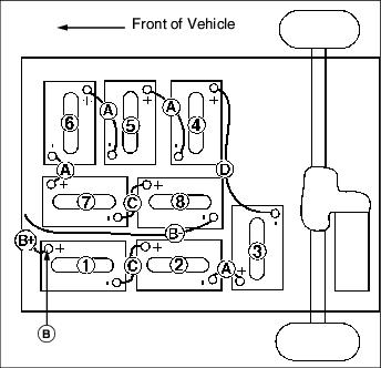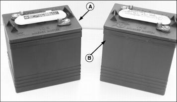 Service BatteryBattery SafetyUsing Deep Cycle BatteriesA - Standard Battery Type (Trojan T105) B - Optional Battery Type (Trojan T145) A cycling battery has a service requirement which is quite different than that of an automotive battery. The automotive battery must deliver high cranking currents at a satisfactory voltage for a few seconds and a portion of the accessory load (10-25 amperes) for a minute or two at a time in city or heavy traffic. Therefore, the automotive battery is designed with maximum plate area and low internal resistance to provide high cranking performance. Power taken from this battery is immediately replaced by the alternator or generator. Therefore, the battery is subjected to shallow discharge cycles (2-3% of the battery capacity). These batteries operate in the 90-100% state of charge. Cycling batteries supply all the motive power and power for the accessories for the vehicles in which they are used. The rate of discharge varies with the type of service. In electric vehicle service, the battery normally provides a nominal intermittent discharge of 75 amperes, with a typical range of 40-350 amperes. The depth of discharge varies with the length of time it is used before being recharged. Once the battery is discharged, it must be recharged to continue operating the vehicle. The batteries used in this utility vehicle usually receive "deep" discharge (60% or more of their capacity). NOTE: New cycling batteries do not have their full capacity until they have been cycled several times (usually between 20 and 50 cycles). Therefore, they can be excessively discharged early in their vehicular life, thereby shortening their service life. Cycling batteries are designed to have good life performance in "deep" cycle service. The major cause of battery failure in "deep" cycle service is poor maintenance: · Dirt or corrosion on battery tops or terminals. · Water too much or too little. · Excessive discharge (lack of charging). A battery is a perishable item that requires periodic maintenance. With a reasonable amount of care, the life of a battery can be significantly extended. The life of a cycling battery is determined not only by the number of cycles (a discharge and recharge) it receives, but also by the depth of each cycle. Assume a set of batteries is used four hours per day; lets call that one cycle. If they are used for eight hours, this is a much deeper discharge and is equivalent to approximately three cycles. A battery set used eight hours per day has a life span approximately one-third that of one used for four hours per day. Electrolyte and Specific GravityThe electrolyte in a lead-acid storage battery is a dilute sulfuric acid solution. A battery with a fully charged specific gravity of 1.250 corrected to 26.7°C (80°F) contains an electrolyte with approximately 33.9% sulfuric acid by weight or 23.5% by volume. The remainder of the electrolyte is water. Pure (concentrated) sulfuric acid has a specific gravity of 1.835. The sulfuric acid in the electrolyte is one of the necessary ingredients for the chemical reactions taking place inside the battery. It supplies the sulfate ions (SO4) which combine with the active material in the plates. It is also the carrier for the electric current as it passes from plate to plate. When the battery terminals are connected to an external load, the sulfate combines with the active materials of the positive and negative plates forming lead sulfate (PbSO4) on both and releasing electrical energy. Specific gravity is a unit of measurement for determining the sulfuric acid content of the electrolyte. The recommended fully charged specific gravity of most batteries today is in the range of 1.250-1.280 corrected to 26.7°C (80°F). The information in this manual will assume a fully charged specific gravity of 1.250 or higher. On the specific gravity scale, water by definition is 1.000. Therefore, electrolyte with a specific gravity of 1.250 means it is 1.250 times heavier per unit volume than pure water. Battery Position and Connection Diagram· A battery position and connection safety/diagram label (A) is attached to the front of the vehicle cargo box. Always refer to the battery position/connection diagram: · Before and during battery installation. · When making electrical connections. · Always replace batteries in the same numbered position and orientation as shown in the battery/position connection diagram. NOTE: Battery cables that are of the same length and labeled the same can be interchanged. · Always replace battery cables in the same position and orientation as shown in the battery/position connection diagram. Battery cables are of specific length for each connection. Battery cables are labeled to assist with proper installation when removed. · Battery cables labeled "A" (4 cables) · Battery pack POSITIVE cable labeled "B+" (1 cable and 1 wire) · Battery pack NEGATIVE cable labeled "B-" (1 cable and 2 wires) · Battery cables labeled "C" (2 cables) · Battery cable labeled "D" (1 cable) · Battery connections are marked: · Always verify that the RED boots covering the battery terminal and wire terminal are on the battery POSITIVE (+) terminal. · Always verify that the BLACK boots covering the battery terminal and wire terminal are on the battery NEGATIVE (-) terminal. Checking BatteriesA visual inspection of vehicle batteries is intended to find and correct potential problems before they create more serious safety and operational concerns. A battery is a perishable item that requires periodic maintenance. With a reasonable amount of care, the life of a battery can be significantly extended. On a daily basis and before the vehicle is placed on charge a visual inspection should be made of the batteries. 1. Park vehicle on a hard, level surface. 2. Turn key switch to the OFF "0" position. 3. Move the directional control lever to the NEUTRAL "N" position. 5. Lift and secure cargo box in the raised position.