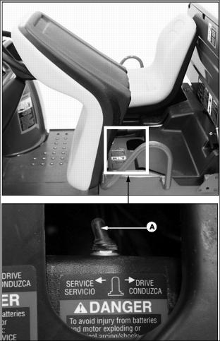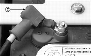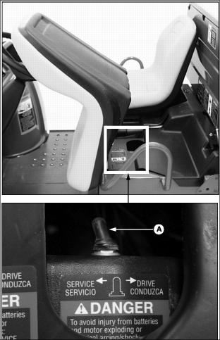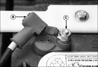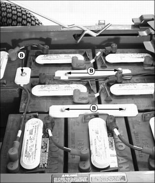 6. Visually inspect all batteries for: · Discolored or melted terminal boots. · Dirt or corrosion on or around the battery terminals. · Damage to battery case or terminals. 7. Tighten battery terminal connections if a problem is detected. 8. Tighten battery hold downs if they are determined to be loose. 9. Clean battery compartment, terminal connections, cable ends and battery(s) if necessary. 10. If necessary, replace any damaged battery(s) and place in an acid resistant container until the battery can be properly disposed of. 11. Check battery electrolyte levels if necessary. Tighten Battery Terminal Connections1. Park vehicle on a hard, level surface. 2. Turn key switch to the OFF "0" position. 3. Move the directional control lever to the NEUTRAL "N" position. NOTE: Turn off all vehicle electric accessories. 5. Raise and tilt operator seat forward. · Move the service/drive switch (A) to the SERVICE position. 6. Lift and secure cargo box in the raised position. 7. Clean battery compartment, terminal connections, cable ends and battery(s) if necessary. 8. Pull the boots (B) on the terminal cables back far enough to expose each terminal connection. 9. Use insulated tools to tighten each terminal connection hex nut (C) to 14-16 N·m (124-142 lb-in.). 10. Install the proper terminal boots (B) (red on positive and black on negative) securely over each battery terminal. 12. Move the service/drive switch to the DRIVE position. Tighten Battery Hold Downs1. Park vehicle on a hard, level surface. 2. Turn key switch to the OFF "0" position. 3. Move the directional control lever to the NEUTRAL "N" position. 5. Raise and tilt operator seat forward. · Move the service/drive switch (A) to the SERVICE position. 6. Lift and secure cargo box in the raised position. 7. Use insulated tools to tighten each battery hold down bolt (B) to 7-9 N·m (62-80 lb-in.). 9. Move service/drive switch to the DRIVE position. Cleaning or Replacing BatteriesCleaning BatteriesCleaning is a key element in battery maintenance, for both safety and performance. Regular cleaning will reduce dirt and corrosion from forming. This reduces the chance of acid contact, and will provide efficient electrical connections. Lack of cleaning can cause the following problems: · Reduced reliability and performance. · Shortened overall battery life. 1. Park vehicle on a hard, level surface. 2. Turn key switch to the OFF "0" position. 3. Move the directional control lever to the NEUTRAL "N" position. NOTE: Turn off all vehicle electric accessories. 5. Raise and tilt operator seat forward. · Move the service/drive switch (A) to the SERVICE position. 6. Lift and secure cargo box in the raised position. 7. Wash down batteries, battery terminals and battery compartment. If battery corrosion is excessive, additional cleaning of the battery(s) and surrounding area may be necessary. 8. Note the position of each battery in the battery compartment and the location of both the positive and negative terminals. 9. Using insulated tools, remove battery pack POSITIVE (+) cable (B) labeled "B+" and wire from positive terminal on battery labeled number "1" in the diagram. 10. Clean all moisture and corrosion in battery compartment with a solution of one part baking soda to five parts water. Rinse with clean water and allow to dry. 11. Pull the boots (C) on the terminal cables back far enough to expose each terminal for cleaning.