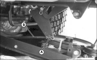 2. Turn adjusting bolt (B) at front of machine frame to adjust lift assist spring: