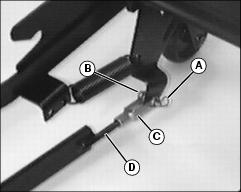 4. Install clevis (C) to tiller frame and fasten with drilled pin (B) and cotter pin (A).
