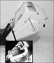3. Rotate transport lever (B) until locking pin disengages from slot (C). Allow transport lever to lock into hole in shield (D).