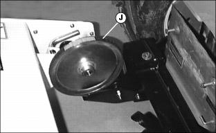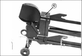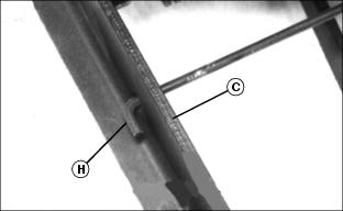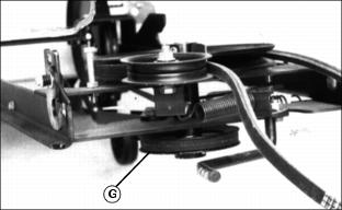 • To loosen belt, turn bolt (G) clockwise until 3 mm (1/8 in.) clearance exists between rod end (H) and vertical frame rail (C).