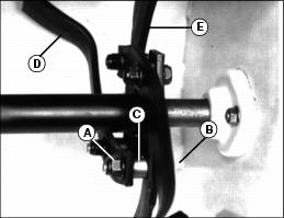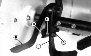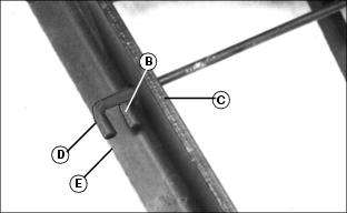 • If rod end is in position (D), extends beyond horizontal frame rail (E), the belt is too loose and must be tightened.