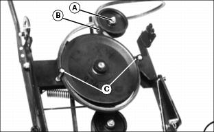 4. Push the arm to the right. Point belt guide toward drive sheave, as shown. Tighten cap screw (C).