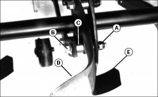 • Left Cluster: Remove nuts (A), bolts (B), spacer (C), two left tines (D), and two right tines (E). Install the new tines and hardware exactly as the old tines and hardware were positioned. Use the pictures to help you install tines correctly.