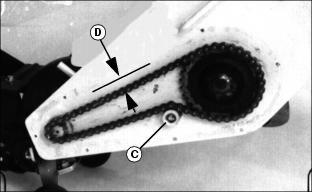 3. Adjust idler (C) until chain deflects or can be pushed up 6-10 mm (1/4-3/8 in.) (D) near center of top links.