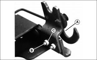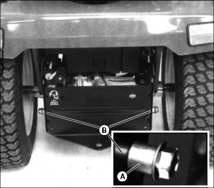 2. Install bolt (B) in proper hole on each side of tractor frame and secure with M12 locknut. Tighten locknut to 105 N•m (78 ft-lb).