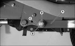 1. Locate draft arm (A) under tractor foot rest. Remove locknut (B), washer (C), and pivot bolt (D). Discard the pivot bolt.