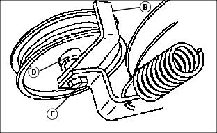 5. Hold bolt head (E) with wrench and tighten M8 locknut completely at top side of idler sheave.