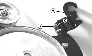 1. Position idler sheave (A) and belt guide (B) onto tensioning arm (C). Make sure shoulder (D) on sheave is seated against the belt guide.
