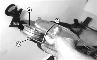 Attach tiller clip (A) to correct side of tiller frame with two M8x25 hex bolts (B) and M8 locknuts (C). Tighten locknuts to 20 N•m (15 ft-lb).