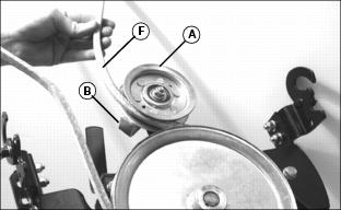 3. Route belt (F) between belt guide (B) and idler sheave (A).