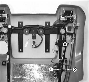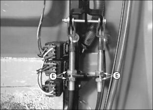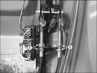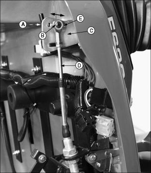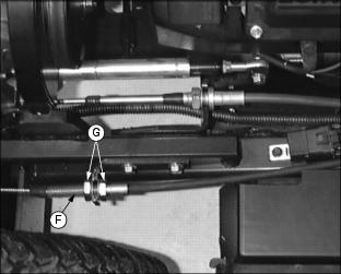 ˇ To decrease brake tension, turn bottom jam nut counterclockwise. ˇ To increase brake tension, turn bottom jam nut clockwise. ˇ Move both control levers forward. ˇ Drive wheels should start to turn freely and front mower should begin to travel forward. ˇ Brakes are adjusted too tight if an audible hydrostatic whine is detected and the front mower does not move. 8. Test and adjust brakes as necessary. Adjust Park Brake-Secondary AdjustmentNOTE: A park brake secondary adjustment is only recommended when the primary adjustment has been completely used up. In most instances a park brake adjustment can be accomplished with a primary adjustment. If further park brake adjustment is required: 2. Before attempting a park brake secondary adjustment: ˇ Loosen primary adjustment jam nuts (E). ˇ Turn both bottom jam nuts fully to the bottom of the primary adjustment assembly. 3. Locate park brake secondary adjustment (F) on each side of the front mower. ˇ Loosen secondary adjustment jam nuts (G). ˇ Turn jam nuts 6mm (1/4 in.) forward on each adjustment cable. 4. Return to the park brake primary adjustment. Make a primary adjustment and tighten jam nuts (E). 5. Test and adjust brakes as necessary. Adjust TrackingA proper tracking adjustment will allow the front mower to maintain a straight line direction of travel. Right and left transmission speeds will vary with travel speed and RPM variations. NOTE: To improve straight line tracking, drive wheel tire pressures must be equal. See Checking Tire Pressure in the Service-Miscellaneous section. Check Tracking3. Move both control levers inward to the centered neutral position. 4. While holding both control levers together, push both control levers forward to a desired mowing speed. 5. If the front mower travels to the right or left, an adjustment is required. Adjust Tracking1. Park front mower on a level surface. 2. Stop engine and engage the park brake. 4. Move both control levers inward to the centered neutral position. 5. Raise and secure cowling in the open position. 6. Loosen locknut (A) securing steering cable eyebolt (B) to the slotted control arm plate (C). ˇ If the front mower moves to the left, adjust right control lever. ˇ If the front mower moves to the right, adjust left control lever. 7. Slide cable rod end (D) inside control arm plate adjustment slot (E). ˇ Cable rod end should be slid forward in adjustment slot to slow down the faster transmission pump. ˇ Adjustments should be done in 6mm (1/4 in.) or less increments. 10. Check tracking adjustment. Continue the adjustment process until the front mower travels in a desirable straight line direction. |