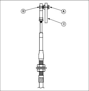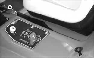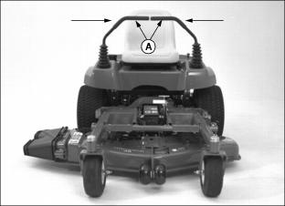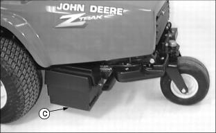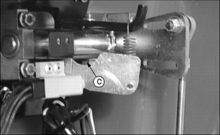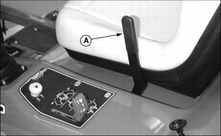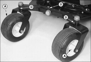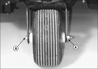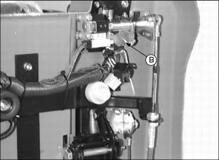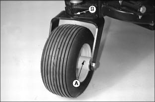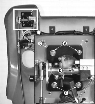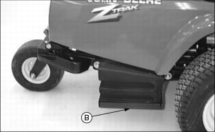 1. Park front mower on a hard level surface. 2. Stop engine and engage park brake. 4. Move both control levers (A) inward to the centered neutral position. 5. Raise and secure cowling in the open position. 6. Locate each control lever neutral detent plate (B) behind the front mower cowling. 7. Lubricate each detent plate slot (C) with a small amount of grease. (See Grease in this section for the proper application.) Checking and Aligning Control LeversCheck Alignment:1. Park front mower on a hard level surface. 2. Stop engine and engage park brake. 3. Move both control levers (A) inward to the centered neutral position. 4. Push both control levers completely forward: ˇ Check control levers for equal forward and up and down alignment. ˇ If positions of the control levers are unequal, an adjustment is necessary. Alignment Procedure1. Raise and secure cowling in the open position. 2. To adjust forward position of control levers: ˇ Slide control lever backplate (C) to desired position within slots. 3. Locate adjustment setscrew (D). ˇ To adjust position of control lever up and outward, turn setscrew clockwise. ˇ To adjust position of control lever down and toward each other, turn setscrew counterclockwise. 4. Lower cowling. Check adjustment. 5. Adjust tracking. (See Adjust Tracking in this section.) Adjusting Park BrakeTest Park Brake:1. Stop front mower on a maximum 17" slope. 2. Raise park brake lever (A) to the (Z)position. ˇ A properly adjusted park brake must prevent the drive wheels from turning. ˇ If the drive wheels turn, a brake adjustment will be necessary. Adjust Park Brake-Primary Adjustment1. Park front mower on a hard level surface. NOTE: Park brake lever (A) must be unlocked and released from the (Z) position prior to performing a park brake adjustment. 3. Raise and secure cowling in the open position. 4. Locate primary park brake adjustment assembly (B) behind the front mower cowling.
