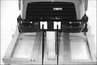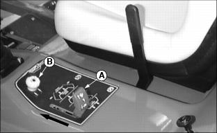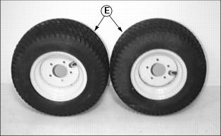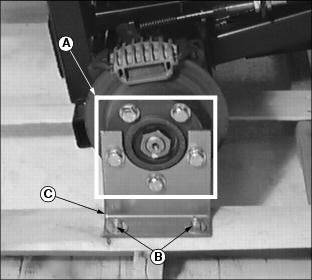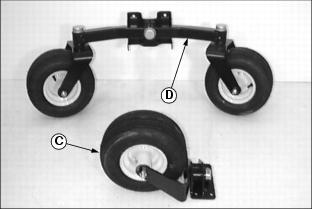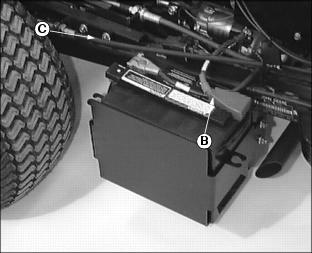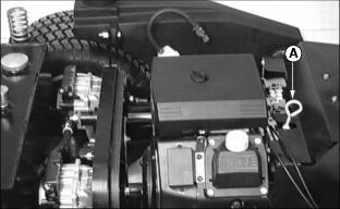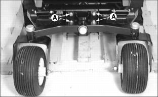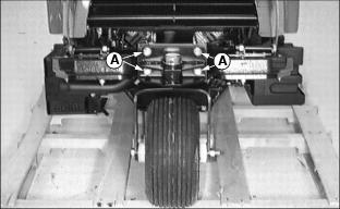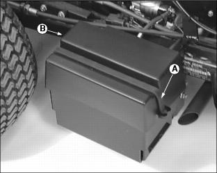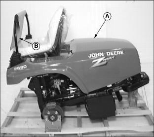 AssemblyIdentify PartsC - Single Rear Steering Wheel Option D - Dual Rear Steering Wheel Option E - Drive Wheels (Turf Tires Shown) Bag of Parts ListNOTE: The ZTRAK front mower is packaged and shipped from the factory without drive wheels and a rear steering wheel assembly. Customer will select rear steering wheel and drive wheel option preferences at time of purchase. Prepare for Assembly1. Remove front mower from the shipping crate. 2. Cut two plastic tie straps (A) securing cowling to the front mower frame. 3. Cut steel bands securing rear of front mower to shipping crate pedestal. Install Rear Steering Wheel Assembly1. Lift rear of front mower with a safe lifting device. 2. Remove wood pedestal from shipping crate. 3. Check steering wheel tire inflation pressure(s). ˇ Keep tire(s) inflated to 110 kPa (16 psi). NOTE: Both locknuts that attach bottom of steering wheel mounting bracket to the rear of the front mower are welded inside the frame. 4. Install rear steering wheel assembly to front mower using four M12x30 flanged hex screws (A) and two M12 locknuts. Picture Note: Top photo shows front mower equipped with a single rear steering wheel assembly. Picture Note: Bottom photo shows front mower equipped with a dual rear wheel steering wheel assembly. Install Front Drive Wheels1. Raise and secure cowling in the open position.(See Raising and Lowering Cowling in the Operating Machine section.) 2. Loosen (5) wheel bolts (A) stored in each drive wheel hub. 3. Remove hardware (B) securing brackets (C) to bottom of shipping crate base. 4. Lift front of machine with a safe lifting device. 5. Remove shipping crate base from under machine. 6. Remove wheel bolts and shipping brackets. Dispose of shipping brackets. 7. Check drive wheel tire inflation pressures: ˇ Keep tires inflated to 69 kPa (10 psi). 8. Attach one wheel to each hub using five wheel bolts, tighten until snug. ˇ Tighten wheel bolts in numbered sequence shown for safe wheel installation. Tighten alternately until recommended torque value is reached. ˇ Tighten bolts to 100 Nˇm (75 lb-ft.). Connect the Battery1. Raise and secure cowling in the open position. 2. Disconnect rubber hold-down strap (A). 3. Remove plastic battery cover (B). 4. Connect RED positive (+) cable (B) to battery. Apply petroleum jelly or silicone spray to terminal to prevent corrosion. Make sure connection is tight. Install the red terminal cover. 5. Connect black negative (-) cable (C) to battery. Apply petroleum jelly or silicone spray to terminal to prevent corrosion. Make sure connection is tight. 6. Check battery electrolyte level. (See Checking Battery Electrolyte Level in the Service-Electrical section.) 7. Install plastic battery cover. Check Tire Pressure2. Check tire pressure with an accurate gauge. Check Engine Oil Level1. Lift and secure cowling in the open position. 2. Remove oil dipstick (A). Wipe it clean. 4. Remove dipstick and check oil level. Oil level must be between ADD and FULL marks on dipstick. Check Mower Deck LevelAfter front mower is completely assembled and the mower deck is installed, check the mower deck level. Check the "Front to Rear" and "Side to Side" level. Refer to the Operating Mower section in the mower deck operator's manual for instruction on how to check and adjust mower deck level. Check Machine Safety Interlock SystemPerform safety system check to make sure the electronic safety interlock circuit is functioning properly. See Testing the Safety Interlock System in the Operating section. Break-In Electric PTO Clutch1. Start engine and push throttle lever (A) up to the full throttle (r) position. 2. With no load on mower, ENGAGE PTO switch knob (B) and allow mower to run for 10 seconds. ˇ DISENGAGE PTO switch knob and wait 10 seconds. |
