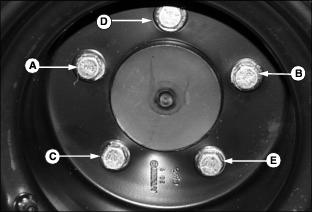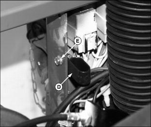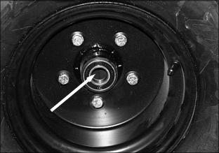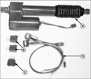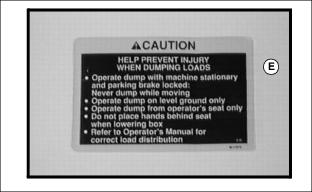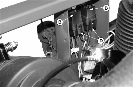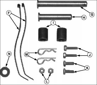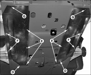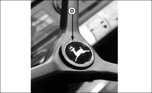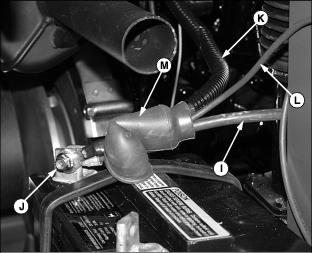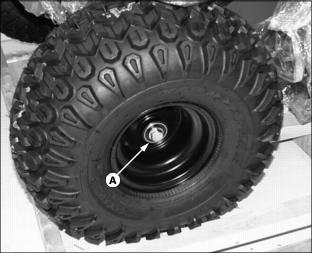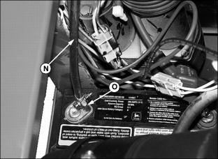 AssemblyDO NOT Modify MachineDo Not make any unauthorized modifications to the vehicle in any way. Modifications can result in making the vehicle unstable, increasing the possibility of roll-over causing severe injury or death. Prepare For Assembly1. Remove top and sides of shipping crate. 2. Locate and identify all parts and hardware. NOTE: The steel cargo box and front bumper brush guard are in a separate crate and has two cargo boxes to a crate. 3. Remove front shipping screws and washers (A), on each side of the front platform. 4. Remove two rear-shipping screws and washers (B), on each side of rear frame. 5. Raise vehicle using a safe lifting device. Remove pallet from under vehicle. 6. Position safety stands under vehicle. Check Tire Pressure and Condition1. Keep heavy-duty tires inflated to 34-41 kPa (5-6 psi) and Extended Mobility Tires (EMT) tires inflated to 27-34 kPa (4-5 psi). 2. Heavy-Duty All Purpose tire inflation pressure can be as low as 27 kPa (4 psi) and EMT tires as low as 14 kPa (2 psi) to provide a better ride. 3. Measure circumference of all tires. Tires with the largest circumference must be placed in the most rearward position to provide the most positive ground contact for drive wheels. 4. Mount wheels with valve stem to outside. Install Front Wheels and Tires (Heavy Duty)1. Install wheels using M16 x 40-flanged cap screw (A). 2. Tighten cap screws to 90 N·m (65 lb-ft.). 3. Install plastic hubcap (G). Install Front Extended Mobility Technology Tires (EMT)1. Install wheel and tire to axle hub on utility vehicle using one M16 x 40-flanged cap screw. Tighten to 90 N·m (65 lb-ft). NOTE: Tire treads should be angled as shown, when viewed from the front of the vehicle. The direction of arrow is forward motion. Install Belt/Chain ShieldsNOTE: Before installing, identify the left and right shields (A) and (B) respectively. It is easier to place shields on frame without rear tires and wheels installed. 1. Locate from below and place front lip of each shield (C) inside of opening (D) towards the front of frame. 2. Use three M6 x16 self-tapping screws to attach each shield to the engine channel (E), use existing holes. 3. Use two M6 x16 self-tapping screws to attach each shield to the side frame (F), use existing holes. 4. Use one M6x20 flange head bolt and washer from the underside to attach the rear part of shield (G) to the vehicle. Use one M6 nut and washer on the inside of frame. Install Rear Wheels and Tires1. Install plastic cap (E) on the rear of each wheel axle shaft hub. Attach one wheel and tire to each rear axle using five wheel bolts. Tighten until snug. 2. Tighten bolts to 90 N·m (65 lb-ft) in sequence (A), (B), (C), (D) and (E). Lubricate Front KingpinsNOTE: In extreme conditions, lubrication should be done every 25 hours. Under normal conditions, it should be done every 50 hours. · Lubricate one grease fitting on each kingpin axle arm. Install Steering Wheel1. Remove rubber protector (A) from steering shaft. Coat steering shaft with multi-purpose grease. 2. With front wheels straight and facing forward, install steering wheel (B). 3. Install nut (C) and tighten until snug. Power Lift KitInstall Power Lift Kit2. Push out dash plug and install the lift switch (C). NOTE: Hold switch in place when connecting connector to avoid switch from popping out of dash. 3. Plug connector (N), from main wiring harness, to switch (C). 4. Install relays (B) to inside of rear frame with two cap screws (K) and nuts (L). Nuts go to inside of frame. 5. Connect relay wiring harness connectors (D) to relays (B), either connector to either relay. Connect connector (P) (yellow wires) on relay harness (D) to connector on main harness (yellow wires) near thermostat. 6. Install lift cylinder (A) (motor facing to rear) with short pin (H), and spring pin (M). 7. Connect wire connector (O), from lift motor, to the relay wiring harness connector (D) (orange and black wires). Add Electrolyte To Batteries