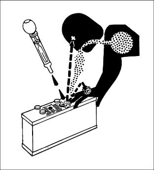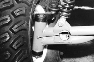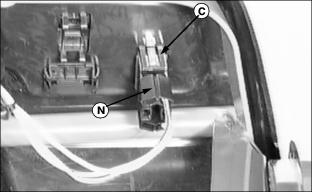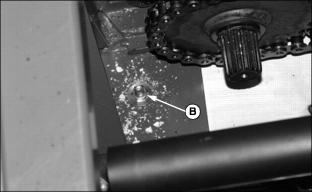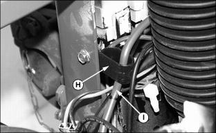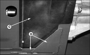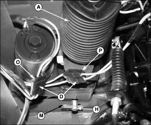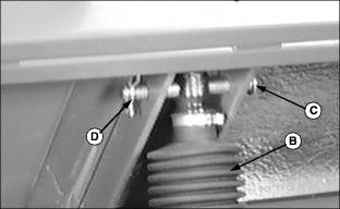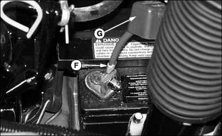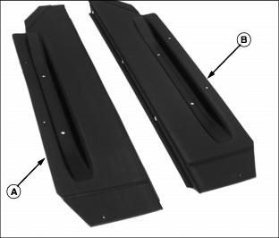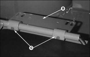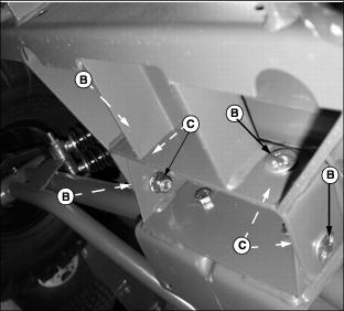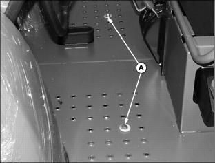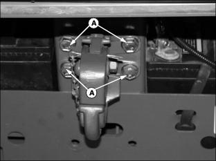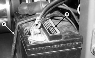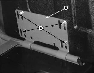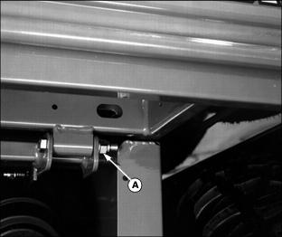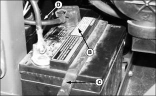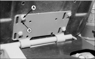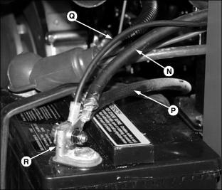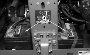 1. Use only battery-grade sulfuric acid electrolyte with 1.265 specific gravity. NOTE: Some utility vehicle batteries may have shipping caps, remove and discard these caps. 2. Remove battery cell caps. (See Checking and Cleaning Battery in Electrical Service section.) 3. Slowly add electrolyte (A) until plates (B) are just covered. 4. Charge each battery at 15 amps for 10 minutes or 7 amps for 30 minutes. DO NOT exceed recommended charging rate. If electrolyte starts to boil over, decrease charging rate. 5. After charging, add electrolyte until level is 6 - 13 mm (0.25 - 0.5 in.) above plates. Install Batteries1. Install batteries in both locations (A), with the positive terminal to front left. Picture Note: Photo MX2817 is left side battery. Photo MX2816 is the right side battery 2. Install manifolds (B) with the vent tube to the front. Attach tube, route tube to the hole in frame. 3. Secure each battery with hold-down strap (C). 4. Install clamp (D) to inside rear frame using M6x20 bolt and M6 flange lock nut (E). 5. Use the red battery cable from the bag of parts. Attach the end of the cable with the square, and red boot (G) to the positive post of the right battery using a M6x20 bolt and M6 flange locknut. Cover the battery post connection with the square boot. 6. Slide the round boot off the other end of the cable. Route the cable (I) up through the clamp (H) on the inside rear frame, over the top of the electric lift motor, and down to near the positive post of the left battery. Install the round boot on the cable. 7. Insert the long red cable (K) coming from the starter and the red wire (L) from the electric lift motor into the round red boot (M). Attach all three cables to the front left positive terminal (J) of the left battery using a M6x20 bolt and M6 locknut and washer. 8. Cover the connection with the round red boot (M). Check to be sure that the cables are routed away from the muffler and electric lift cylinder motor. Obtain the black battery cable from the bag of parts. Attach one end of the cable (N) to the negative, rear post (O) of the right battery using a M6x20 bolt and M6 locknut and washer. Route the cable over to the rear of the electric lift motor, towards the rear, negative post of the left battery. 9. Attach the black (negative) cable (N) coming from the right battery, the black (negative) cable (P) coming from the engine block, and the black wire (Q) coming from the electric lift motor, to the rear, negative terminal (R) of the left battery using a M6x20 bolt and M6 locknut and washer. Check to be sure that the cables are routed away from the muffler and moving parts. 10. Tie the excess lengths of wire from the electric lift motor with tie straps, such that they are kept away from the muffler, the battery, and any moving parts. 13. Slide protective covers down over positive battery post and terminal. Install Hitch1. Install four M12x35 flange bolts (A) through the hitch plate and vehicle frame, with bolt heads facing out. 2. Tighten to standard torque values the four nuts on the inside of frame. Install Bumper Brush Guard1. Fasten front bumper brush guard (A) to utility vehicle with four M12x25 carriage bolts (B) and four-flange lock nuts (C), nuts to the inside. Install Front Lift and Tie-Down Rings1. Install lift and tie-down ring (A) in the existing holes in the front bumper. 2. Hold ring with wooden or plastic bar to prevent rotation of the ring during tightening of the nut. NOTE: The ring must be free to rotate. If it does not, loosen the nut until it does. 3. Tighten the 3/4 inch nut (B) until it just contacts the shoulder on the bolt. Install Driver Seat1. Remove hardware (A) from bottom of seat base bracket (B). 2. Position rubber seat bushings (C) onto seat frame rail with tabs facing to the rear. 3. Position seat base bracket (B) onto rubber seat bushings (C). NOTE: The passenger seat does not use a bolt in the left rear hole. 4. Rotate seat base bracket (B) into an upward position and attach seat with hardware (A). Adjust SeatNOTE: Slots (B) allow the moving of seats forward and rearward to provide operator comfort. The passenger seat if moved to the most rearward position will contact fender (indicated by the arrow) or contact windshield (if equipped) if seat is rotated forward. 1. Loosen four cap screws (A). NOTE: Seat can't be placed back all the way, because the back of the seat will come in contact with the front of the rear fender. 2. Move seat forward or rearward in slots (B) to position desired. Install Cargo Box1. Safely remove cargo box from crate. NOTE: A hoist may be necessary to lift and align cargo box on to frame. 2. Place cargo box onto frame; align hinge tabs on rear of frame and bushings on cargo box. 3. Attach box at rear on each side using M12 x 90 cap screws and flanged lock nuts (A). Install cap screw with threads to the outside of vehicle. NOTE: It may be necessary to tighten cap screws to squeeze tabs to minimize noise from vibration. Use spray lube to eliminate squeaks until pivot points wear in. 4. Tighten cap screws pulling in tabs until they contact ends of bushings. 5. Spray bushings and tab area with a spray lubricant. 6. Attach electric lift cylinder to cargo box. Lift cargo box by hand and safely prop box open for lift cylinder access.