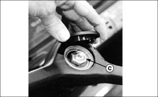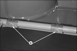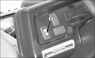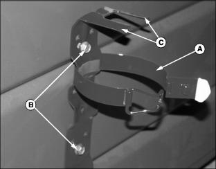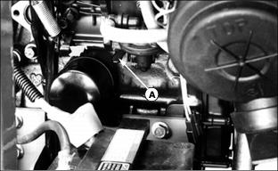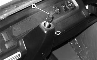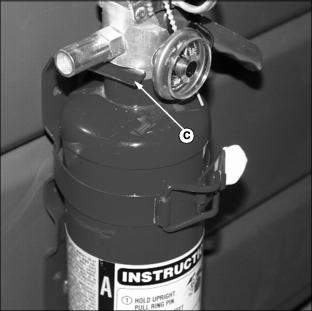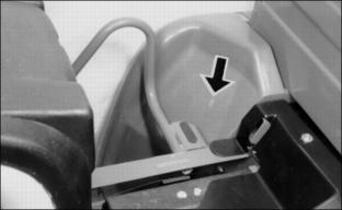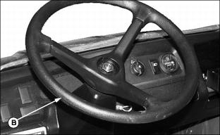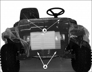 7. Turn ignition switch to RUN position ONLY. Press RAISE position on switch to extend cylinder. 8. Fasten lift cylinder (B) to cargo box with long pin (C) and spring pin (D) from the Lift Cylinder Kit. 9. Apply decal (E) on front left side of load guard as shown: · Remove backing, use squeegee to carefully smooth decal on load guard to avoid air bubbles and wrinkles. If air bubbles occur, pick with a pin and smooth out. · Decal MUST be fully displayed and NOT obstructed by operator's seat. Install Fire Extinguisher and Bracket1. Place the bracket (A) against cargo box front between seats and align with already existing holes. NOTE: Bolt heads to the outside. 2. Tighten locknuts onto the two M6x16 bolts (B). 3. Place the fire extinguisher into the bracket, so that the bracket tongues (C) fit into the grooves of the extinguisher head. 4. Close clamp around extinguisher body. Remove Protective Plastic From Hood And Fender Covers1. Remove screws (A) and lift hood up and off vehicle. 3. Using a sharp utility knife, carefully slit protective plastic where fenders join metal frame. 4. Pull plastic up and away from fender, then remove remaining plastic in joint by pulling from below. 5. Remove protective plastic from rear fenders and box extensions. 6. Replace hood, tighten top screws first then push hood upward leaving space all around headlight housings. Cleaning And Polishing Plastic Hood And Fenders1. Remove excess dust or dirt. 2. When surface is dry, spray on PLEDGE®* and leave on 30 to 60 seconds. 3. Using a dry soft cloth (i.e. cheesecloth) wipe off to bring out lustre. Prepare Fuel System1. Add diesel fuel to fuel tank. 2. Open both fuel shut-off valves: · Arrow indicator up on the fuel tank shut-off valve. · Lever down, pointing to "O" (open) position on fuel filter shut-off valve. 3. Move fuel pump primer lever (A) up and down. Continue operating lever until: · Sight bowl of fuel filter is full of fuel. |