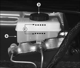 ˇ Fluid levels must be maintained between the "MAX" maximum and "MIN" minimum fill lines (C).
