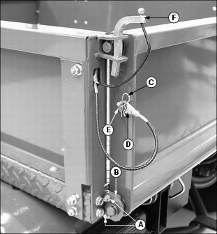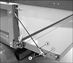 3. Remove spring locking pin (C) and cable (D) from each drilled stud (E) to fully lower tailgate.