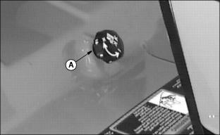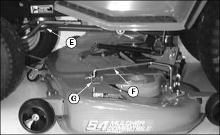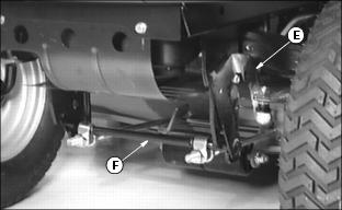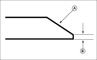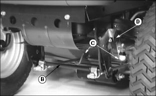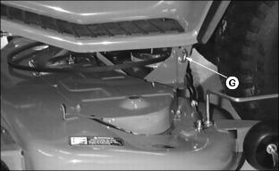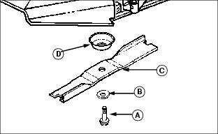 Service MowerAvoid Injury From Contacting BladesRemoving Mower1. STOP engine, LOCK park brake, push PTO switch down to DISENGAGE, turn key to the OFF position, and remove key. 2. Raise mower to TRANSPORT (upper) position using lift lever. 3. Set cutting height knob (A) to 25 mm (1 in.). 4. Put wood blocks under each side of mower. 5. Lower mower to MOWING (lower) position, bring deck down onto blocks. Picture Note: 54-Inch Deck Shown 6. Release drive belt tension rod (B) from bracket (C). 7. Remove belt from engine drive sheave (D). 8. Pull out and push down on lever (E) to release front lift rod assembly (F) and remove from front of deck. Picture Note: 54-Inch Deck Shown 9. Disconnect draft arms, one on each side, by pulling spring loaded J-pins (G) out. 10. Put mower lift lever in the TRANSPORT (upper) position. 11. Slide mower out from under the tractor. Installing Mower1. STOP engine, LOCK park brake, push PTO switch down to DISENGAGE, turn key to the OFF position, and remove key. 2. Raise mower lift lever to TRANSPORT (upper) position. 3. Slide mower under the tractor and line up mower lift brackets with rear draft arms. 4. Put wood blocks under each side of mower. 5. Put mower lift lever in the MOWING (lower) position. Picture Note: 54-Inch Deck Shown 6. Install rear draft arms, one on each side of tractor, to mower lift brackets with spring loaded J-pins (A). 7. Put front lift rod assembly (B) in slotted brackets (C) on mower deck and install the front lift rod assembly to the front of the tractor frame. 8. Push up on lever (D) and lock into tractor frame. Picture Note: 54-Inch Deck Shown 9. Put mower drive belt (E) on engine drive sheave. 10. Push drive belt tension rod (F) into bracket (G). 11. Raise mower lift lever to TRANSPORT (upper) position. 12. Remove wood blocks from both sides of mower. Replacing Mower Drive Belt1. STOP engine, LOCK park brake, push PTO switch down to DISENGAGE, turn key to the OFF position, and remove key. 2. Remove mower deck. (See Removing Mower in Removing Mower section.) Picture Note: 54-Inch Deck Shown 3. Remove three cap screws and belt shields (A). Picture Note: 48-Inch Deck Shown 4. Put drive belt tension rod (B) in the released position as shown and disconnect idler spring (C). 6. Clean upper mower deck and sheaves. 7. Inspect belt for wear or damage; replace as necessary. 8. Install belt (D) on mower deck as shown. 10. Install two belt shields and fasten with three cap screws. 11. Install mower deck. (See Installing Mower in Installing Mower section.) Adjusting Mower Drive Belt Tension1. STOP engine, LOCK park brake, push PTO switch down to DISENGAGE, turn key to the OFF position, and remove key. 3. Remove three cap screws and belt shields. Picture Note: 48-Inch Deck Shown 4. Leave drive belt tension rod (A) in the open position. 5. Loosen nut (B) on flat idler. 6. Slide flat idler forward or back to get the desired belt tightness and tighten flat idler nut. 7. Install two belt shields and fasten with three cap screws. Servicing Mower Blades1. Raise mower deck to gain access to mower blades. If necessary, remove mower deck. 2. Using a wooden block, prevent mower blades from spinning. 4. Remove cap screw (A), round blade washer (B), blade (C) and deflector cup (D). 5. Inspect blades; sharpen/balance or replace as necessary. 1. Lightly lubricate cap screw threads with a general purpose grease or oil. This lubrication is to prevent rusting and seizing. 2. Install deflector cup (D) on spindle. 3. Position mower blade (C) with the cutting edge towards the ground onto the mower spindle. 4. Install blade washers (B) and make sure 2 index marks (E) are visible when installed. 5. Install and tighten cap screw (A) by hand until mower blade is in full contact (fully seated) with spindle. 6. With mower blade blocked, to prevent spinning, tighten cap screw (A) to 84 Nˇm (62 lb.-ft.). Sharpening Blades1. Sharpen blades with grinder, hand file or electric blade sharpener. 2. Keep original bevel (A) when you grind. 3. Blade should have 0.40 mm (1/64 in.) cutting edge (B). Balancing Blades2. Put blade on nail in vise or on vertical wall stud. Turn blade to horizontal position. |