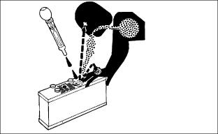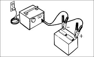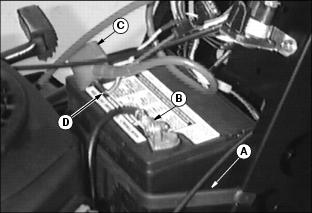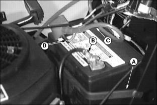 Service ElectricalChecking the Batteryˇ Keep battery and terminals clean. ˇ Recharge, if necessary, at 6-10 amperes for 1 hour. (See Charging the Battery in this section.) Removing and Installing the Battery1. Turn ignition key off and raise hood. 2. Remove rubber hold-down strap (A). 3. Disconnect negative (-) battery cable (B). 4. Remove red cover (C) from positive (+) battery terminal. Remove positive (+) cable and blue harness wire (D) from battery. 6. Install the battery following these steps in reverse order. (See Connect the Battery in the Assembly section.) Clean Battery and Terminals1. Turn ignition key off and lift hood. 2. Remove rubber hold-down strap (A). 3. Disconnect BLACK (-) battery cable (B) first. 4. Disconnect RED (+) battery cable (C) and blue harness wire (D) and remove battery from mower. 5. Wash battery with solution of four tablespoons of baking soda to one gallon of water. Be careful not to get the soda solution into the cells. 6. Rinse the battery with clean water. Let dry. 7. Clean terminals and battery cable ends with wire brush until bright. 8. Apply petroleum jelly or silicone spray to terminal to prevent corrosion. 9. Reinstall battery. (See Removing and Installing the Battery in this section and Connect the Battery in the Assembly section.) Charging the Battery