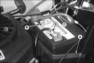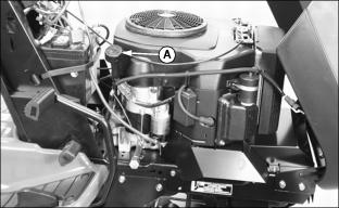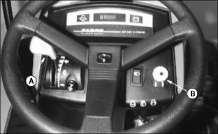 AssemblyIdentify PartsClear Plastic Bag Contains:Bag of Parts Contains:NOTE: There is an extra ignition key strapped to one of the seat suspension springs. Install Steering Wheel1. Put front wheels in the straight forward position. 2. Lubricate the steering shaft. 3. Install steering wheel with logo in the upright position. 4. Install shoulder bolt (A). Drive bolt in until head of bolt contacts steering wheel. 5. Install washer and nut (B). 6. Tighten lock nut until it is snug. Do not tighten lock nut to pull washer or head of bolt into steering wheel. Add Electrolyte To Battery1. Use only battery-grade sulfuric acid electrolyte with 1.265 specific gravity. NOTE: Some batteries may have shipping caps remove and discard these caps 3. Slowly add electrolyte (A) until plates (B) are just covered. 4. Charge battery at 15 amps for 10 minutes or 7 amps for 30 minutes. DO NOT exceed recommended charging rate. If electrolyte starts to boil over, decrease charging rate. (See Charging Battery in the Service Electrical section.) 5. After charging, add electrolyte until level is 6 - 13 mm (0.25 - 0.5 in.) above plates. Install and Connect Battery1. Install battery and secure with hold-down strap (A) 2. Remove and discard the RED positive (+) protective cap from the positive (+) battery terminal. 3. Connect blue harness wire (B) and RED positive (+) cable (C) to battery. Apply petroleum jelly or silicone spray to terminal to prevent corrosion. Make sure connection is tight. Install the red terminal cover. 4. Remove and discard the BLACK (-) protective cap from the negative battery terminal. 5. Connect black negative (-) cable (D) to battery. Apply petroleum jelly or silicone spray to terminal to prevent corrosion. Make sure connection is tight. Check Engine OilPicture Note: Model 2554HV used for photo purposes. 2. Remove dipstick (A). Wipe with clean cloth. 3. Insert the dipstick into the tube and rest the oil fill cap on the tube. Do not thread the cap onto the tube. 4. Remove dipstick to check oil level. 5. Oil must be between ADD and FULL marks. 6. Add oil to FULL mark if necessary. DO NOT overfill. (See Engine Oil in Service Engine section.) 7. Install and tighten dipstick. Lower hood. Break-In Electric PTO ClutchPicture Note: Model S2554 used for photo purposes. 1. Start engine and push throttle lever (A) up to full throttle (r) position. 2. With no load on mower, ENGAGE PTO (B) and allow mower to run for 10 seconds. 3. DISENGAGE PTO and wait 10 seconds. 4. Repeat Steps 2 and 3 for 12-15 cycles. 5. PTO clutch is now properly burnished. Check Machine Safety SystemPerform safety system check to make sure the electronic safety interlock circuit is functioning properly. Perform all six Tests. (See Testing Safety System in the Operating section.) Checking Tire Pressure |