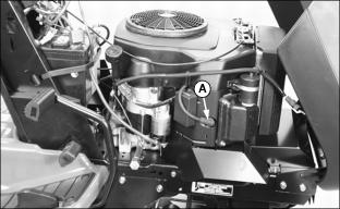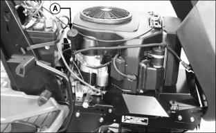 Service EngineAvoid FumesEngine Warranty Maintenance StatementMaintenance, repair, or replacement of the emission control devices and systems on this engine, which are being done at the customers expense, may be performed by any nonroad engine repair establishment or individual. Warranty repairs must be performed by an authorized John Deere dealer. Adjusting CarburetorNOTE: Carburetor is calibrated by the engine manufacturer and should not require any adjustments. If engine is operated at altitudes above 1829 m (6,000 ft.), some carburetors may require a special high altitude main jet. See your John Deere dealer. Possible engine surging will occur at high rpm with no load (with transmission in "N" neutral and mower blade engagement lever disengaged). This is a normal condition due to the emission control system. If engine is hard to start or runs rough, check the Troubleshooting section of this manual. After performing the checks in the troubleshooting section and your engine is still not performing correctly, contact your John Deere dealer. Engine OilUse oil viscosity based on the expected air temperature range during the period between oil changes. The following John Deere oils are preferred:Other oils may be used if above John Deere oils are not available, provided they meet the following specification:· API Service Classification SG or higher Checking Engine Oil Level1. Park tractor on a level surface. STOP engine. Let engine cool. 3. Clean area around dipstick to prevent debris from falling into crankcase. Picture Note: Model 2554HV used for photo purposes. 4. Remove dipstick (A). Wipe with clean cloth. 5. Insert dipstick into the tube and rest the oil fill cap on the tube. DO NOT thread the cap onto the tube. 6. Remove dipstick and check the oil level. 7. Oil must be between ADD and FULL marks. 8. Add oil to FULL mark if necessary. DO NOT overfill. 9. Install and tighten dipstick. Lower hood. Changing Engine Oil2. Park tractor on level surface. STOP engine, LOCK park brake and remove key. 3. Wipe debris and dirt from around dipstick. Picture Note: Model 2554HV used for photo purposes. 4. Put drain pan under drain extension (A). 5. Remove drain plug (A) and drain oil into oil drain pan. 6. Replace drain plug. Tighten to: 13.6 N·m (10 ft. lb.). 7. Remove dipstick (B) and refill with new oil of recommended grade. · Approximate engine oil capacity: 2.1 L (2 qt.) 8. Install dipstick and then remove to check oil level. (See Checking Engine Oil in this section.) Oil level must be between ADD and FULL marks. Do not overfill. 9. Install and tighten dipstick. 10. Start engine and check for oil leaks. Correct any leaks before operating. Changing Engine Oil Filter1. Park tractor on level surface. STOP engine, LOCK park brake and remove key. 2. Drain engine oil and replace with fresh oil. (See Changing Engine Oil in this section.) 3. Wipe debris and dirt from around oil filter. Picture Note: Model 2554HV shown for photo purposes. 4. Put a small shallow pan or funnel under oil filter (A) to catch oil drained from filter. 5. Remove old filter (A) and wipe off filter tray with a clean cloth. 6. Lightly oil filter gasket with fresh, clean oil. 7. Install replacement oil filter. Turn oil filter to the right (clockwise) until rubber gasket contacts filter adapter. Tighten filter an additional one-half turn. 8. Start and run engine at idle to check for leaks. Stop engine. 9. Check oil level. (See Checking Engine Oil Level in this section.) 10. Add oil if required. (See Engine Oil in this section.) Cleaning Air Intake Screen and Engine Fins1. STOP engine. LOCK park brake and remove key. Picture Note: Model 2554HV shown for photo purposes. 3. Clean air intake screen (A), oil cooler fins (B) and external surfaces, with rag, brush, vacuum or compressed air. Lower hood. Checking and Cleaning Air Cleaner ElementsNOTE: It may be necessary to check the air filter more frequently if operating vehicle in dusty conditions. 2. Clean any dirt and debris from the air cleaner area before removing cover. Picture Note: Model 2554HV shown for photo purposes. 4. Inspect foam precleaner (B) and element (C) without removing. 5. If precleaner (B) is dirty, carefully remove from filter, leaving element (C) in the air cleaner housing. NOTE: DO NOT wash paper element. 6. Wash precleaner (B) in a solution of warm water and liquid detergent. 7. Rinse precleaner thoroughly. Squeeze out excess water in a dry cloth until precleaner is completely dry. 8. Put approximately 30 ml. (1 oz.) of clean engine oil onto precleaner. Squeeze precleaner to distribute oil evenly. Squeeze out excess oil with a clean cloth. 9. Remove and replace filter element (C) ONLY if damaged or very dirty. 10. Carefully remove element (C) from air cleaner housing. Replace with a NEW element. 11. Carefully clean air cleaner housing. Prevent any dirt from falling into carburetor. 12. Install precleaner onto new filter element and install into air cleaner housing. 13. Install cover. Lower hood. Checking Spark Plugs1. Stop engine. Remove key. Lift hood. Picture Note: Model 2554HV used for photo purposes. 2. Disconnect spark plug wires (A), one on each side, and remove spark plugs. 3. Clean spark plugs carefully with a wire brush. 4. Check plug gap with a wire feeler gauge. · Gap should be 0.76 mm (0.030 in.) 5. To change gap, move the outer electrode. 6. Install and tighten spark plug(s). · Tighten plug(s) to: 24.4/29.8 N·m (18/22 lb.-ft.). 7. Connect the spark plug wires. Replacing Fuel Filter