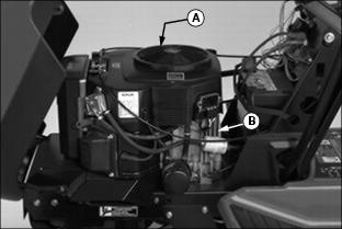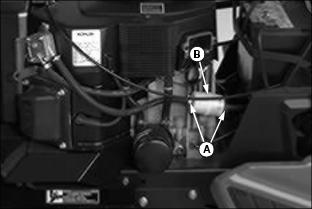 NOTE: Change filter when fuel is low in fuel tank. 1. Park tractor on a level surface. 2. STOP engine. Remove key. Let engine COOL. Picture Note: Model 2554HV shown for photo purposes. 4. Using pliers, slide hose clamps (A) away from fuel filter (B). 5. Disconnect hoses from filter. 6. Connect hoses to new filter. |