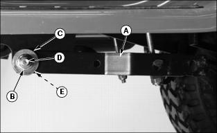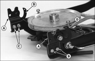 1. Locate draft arms (A) under left and right tractor foot rests. Remove locknut (B), washer (C), and pivot bolt (D) from each side. Discard original pivot bolts.