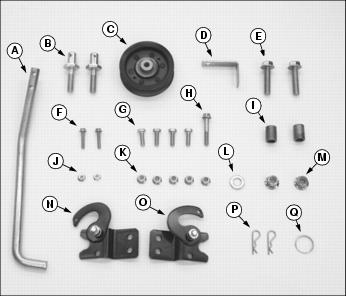 3. Install M8 x 1.25 x 50 mm flange bolt (E) from bottom side of tensioning arm. Install M8 x 1.25 locknut on top side of sheave finger tight only.