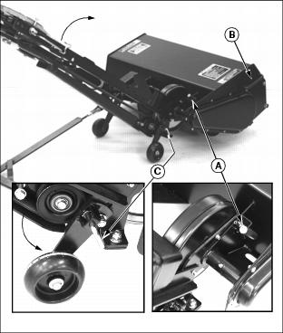 2. Unlock locking pin (C) and rotate wheel down into engaged position and make sure locking pin locks in locking hole. Lock right frame wheel down into engaged position in similar fashion.